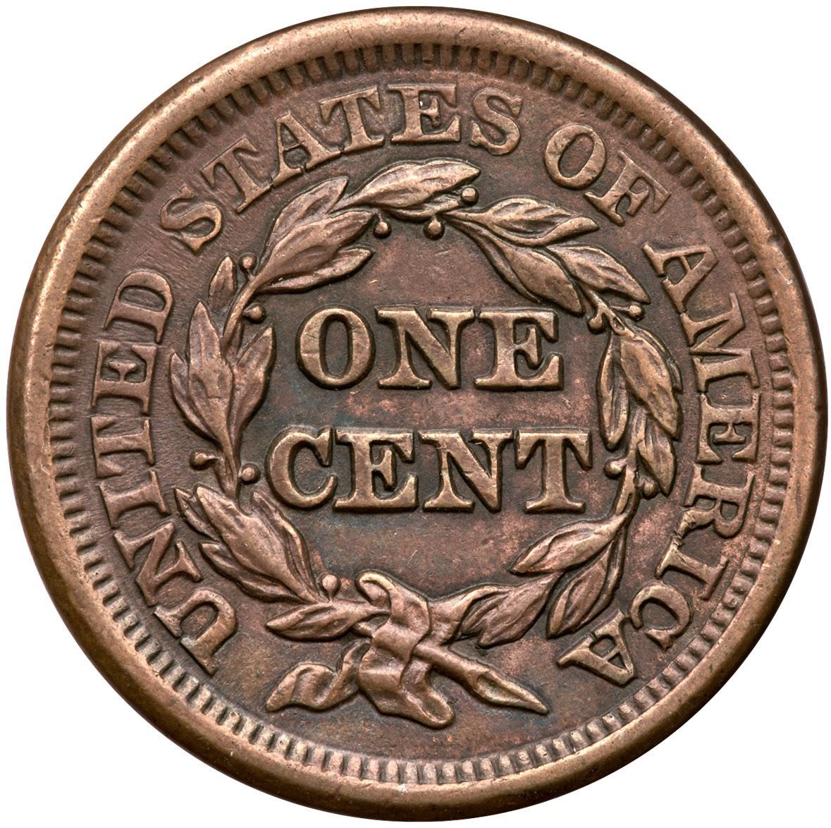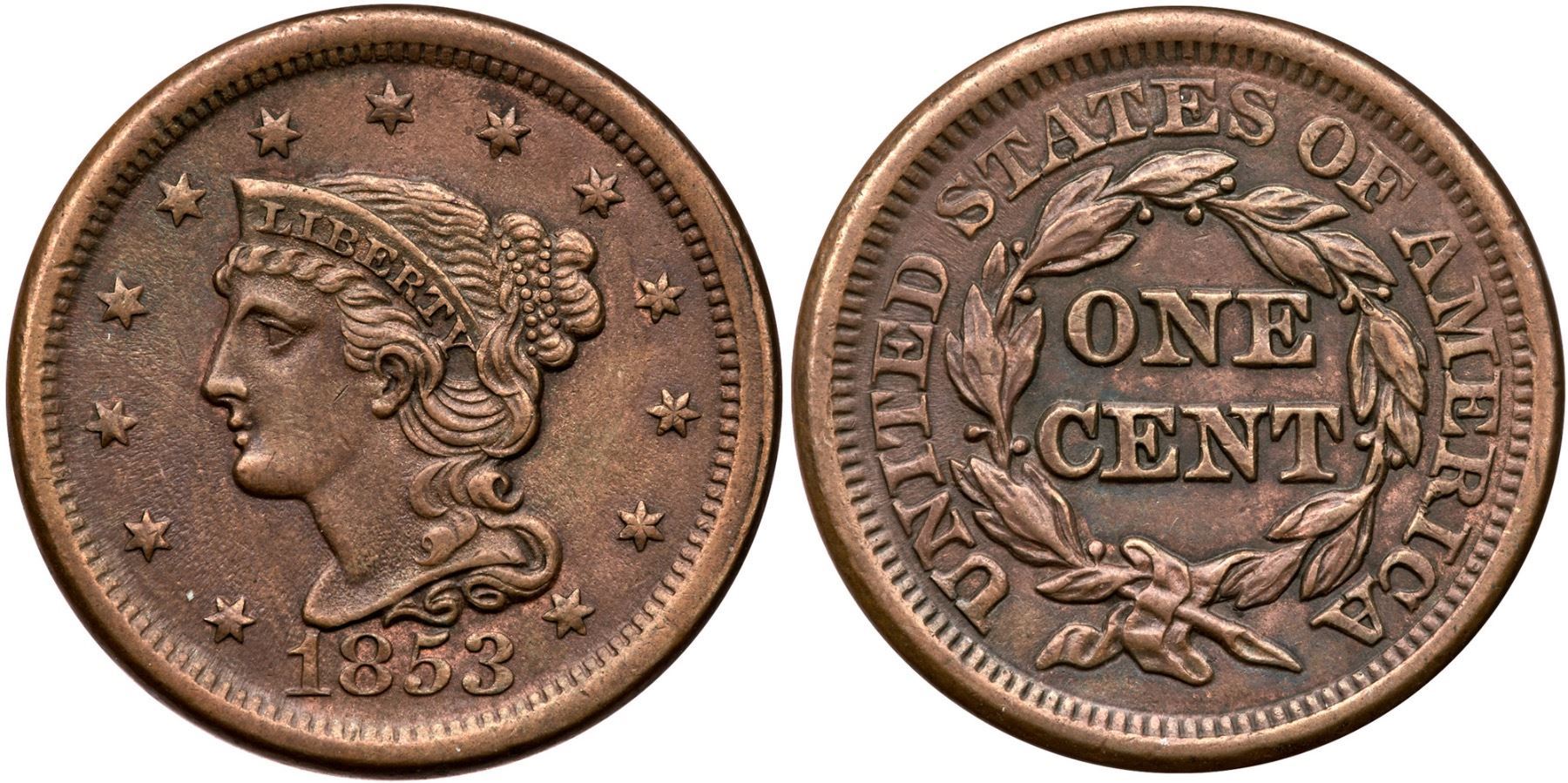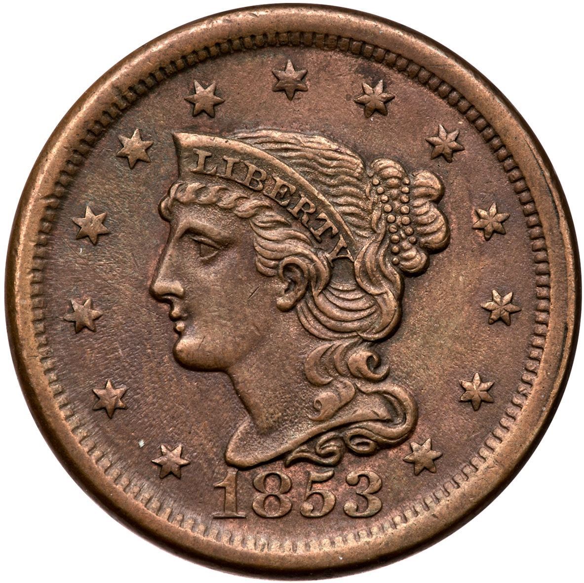 1853 N-27 R-2 XF45AU50 sharpness but recolored and now toned olive and chocolate browns. The only notable mark is a wispy hairline scratch from the dentils at star 4 curving down through the mouth and cheek that blends in well. Smooth surfaces.Certificate Number: Pedigree: Ex; Tim Paquette