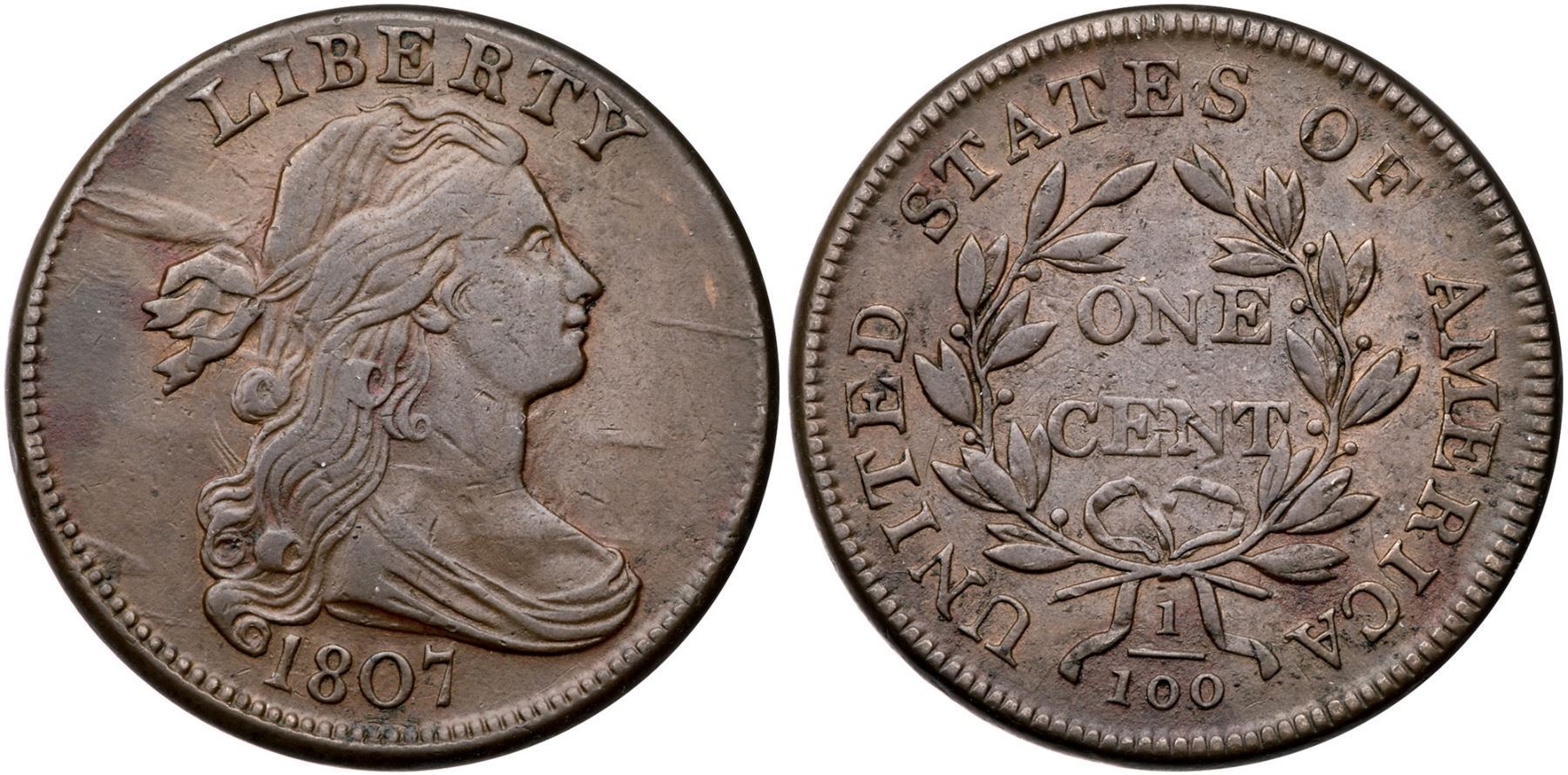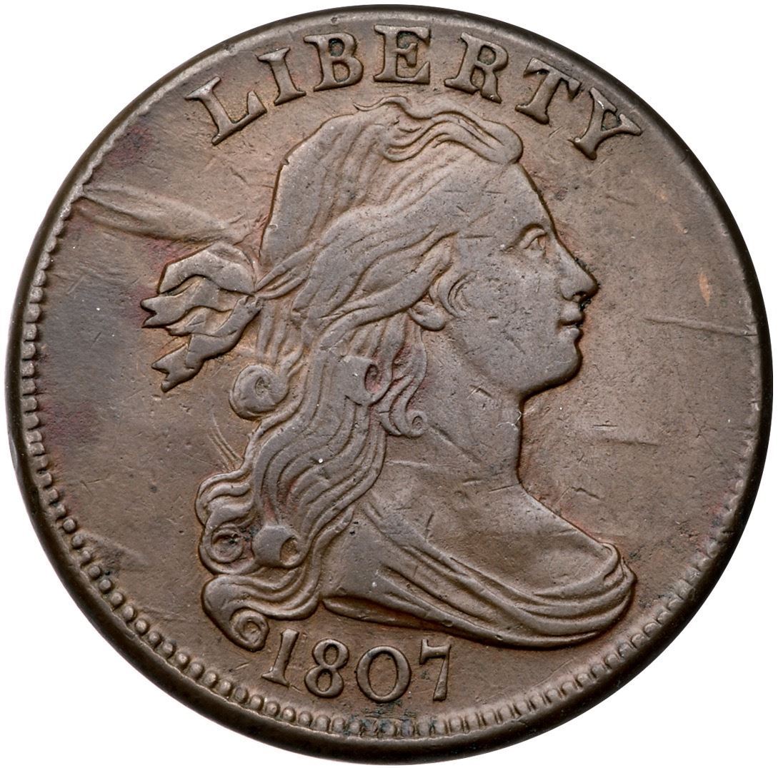 1807 S-271 R-1 "Comet" Variety VF25Pleasing medium brown with hints of underlying tan. There is some deep reddish tones on the central obverse, around and behind the hair braid, and the lower reverse. Only a few trivial marks, a vertical pin scratch over N in CENT the only worth noting. Smooth surfaces. Breen State VII with the bold comet break on the obverse. Broken out of an old green PCGS VF30 holder (1531.30/2302676, tag included)Certificate Number: Pedigree: Ex; Dr. Jack Adams Collection 5/1992 - Phil Moore