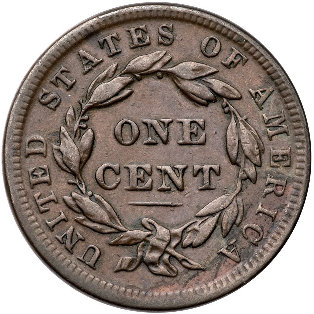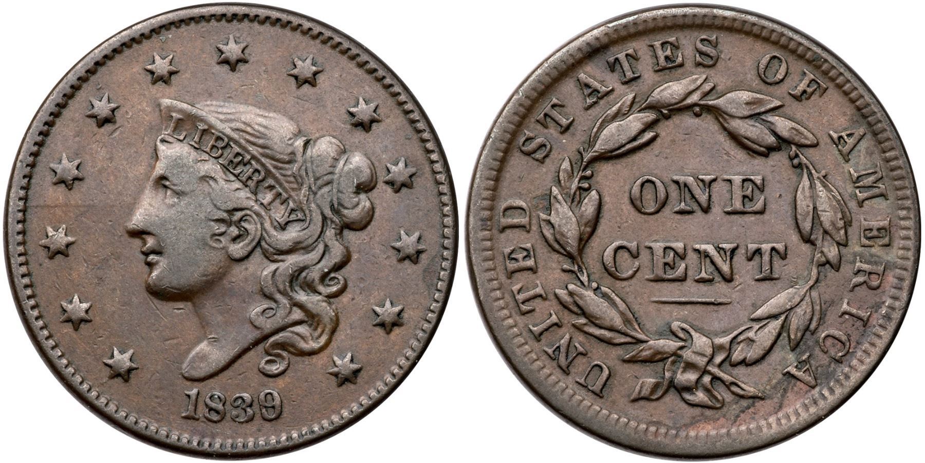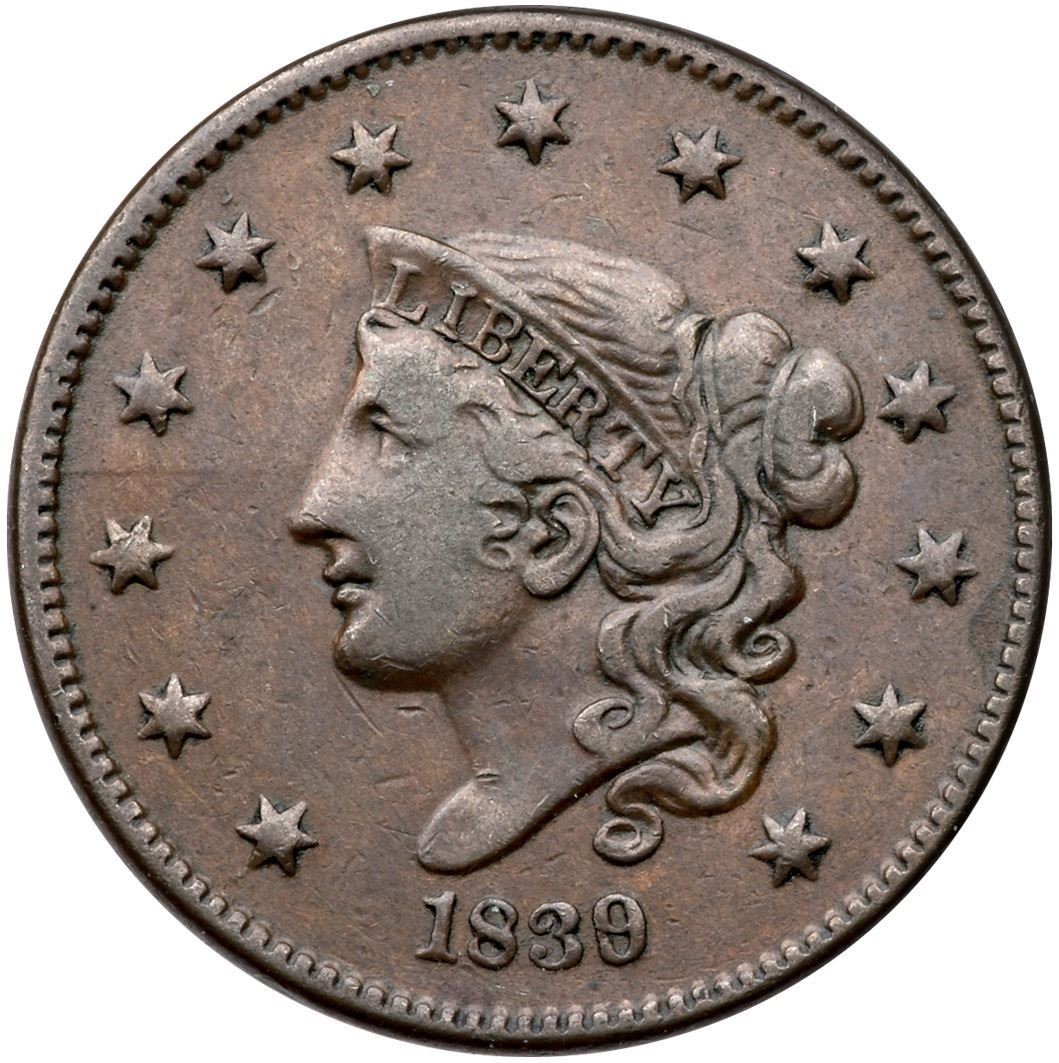 1839/6 N-1 R-3 Head of 1836 VF25Glossy attractive chocolate brown and light steel with hints of ruddy brown and olive around AMERICA. A small pin scratch under the chin is the only mark. Smooth, hard surfaces. Graded VF25 by Del Bland.Certificate Number: Pedigree: Ex; Del Bland - Carl Windon 3/1988 - Del Bland - S Hodge EAC 4/2001 - Phil Moore