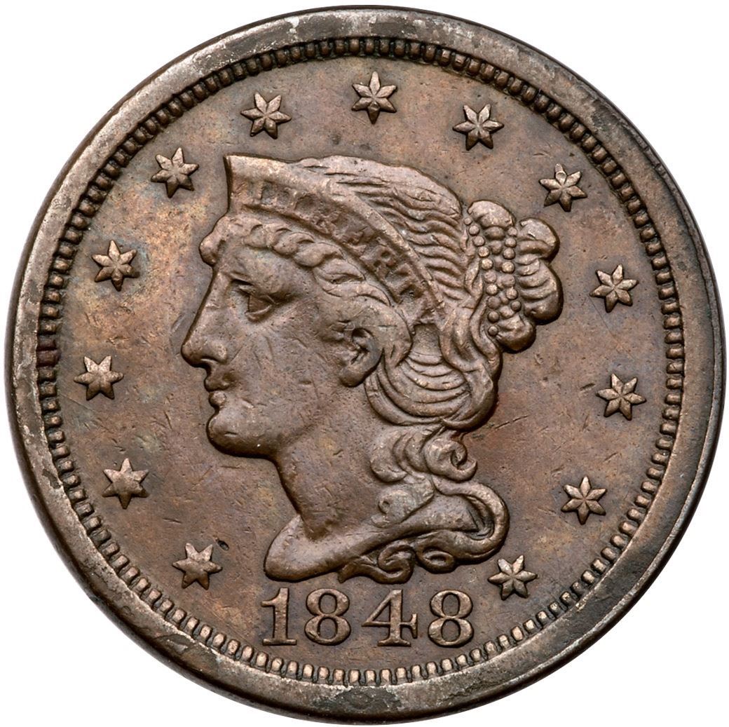 1848 N-32 R-5 VF20Glossy light olive and chocolate browns. There are traces of faint roughness in a few places on the obverse rim, otherwise the surfaces are smooth and attractive. No verdigris, and only a few minor marks. EDS, the die cracks on the reverse are light but visible, and parallel die lines show from the dentils at stars 11-13. Tied for CC#5 honors in the Grellman census.Certificate Number: Pedigree: Ex; Discovered by Allen Ross - Goldbergs 2/2017:715 - Phil Moore