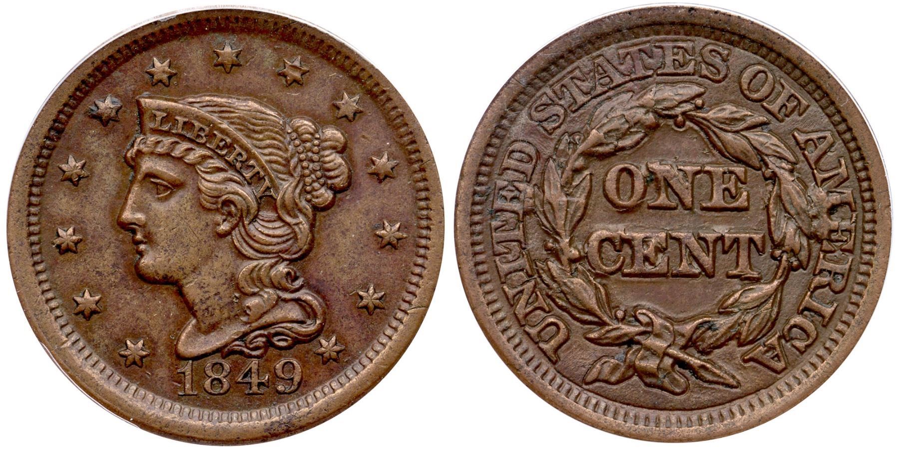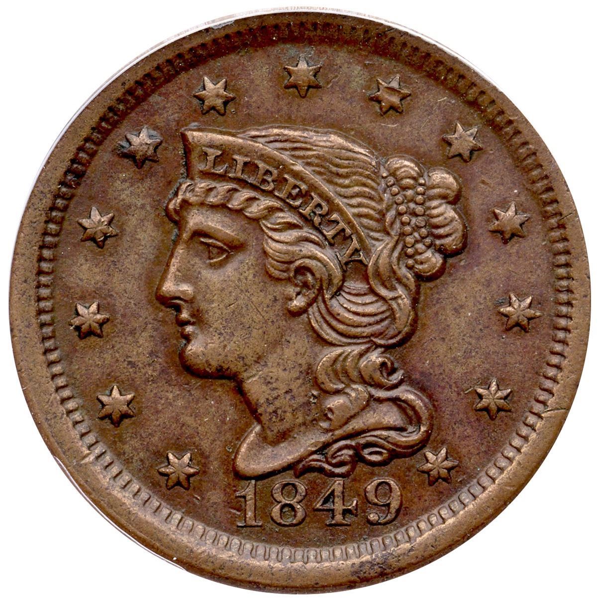 1849 N-2 R-2 ANACS EF45Frosty light olive blending to light chocolate in protected areas. Microscopic specks of darker olive brown are sprinkled over the obverse, and these are visible only under strong magnification. Sharply struck LDS, die state dd, with extensive crumbling around devices on the reverse. Our grade is EF40.Certificate Number: 7341055Pedigree: Ex; C. Fuhr 1962 - Charles B. Wallace Collection - Early Cents Auctions 1/2024:373 - Doug Durasoff