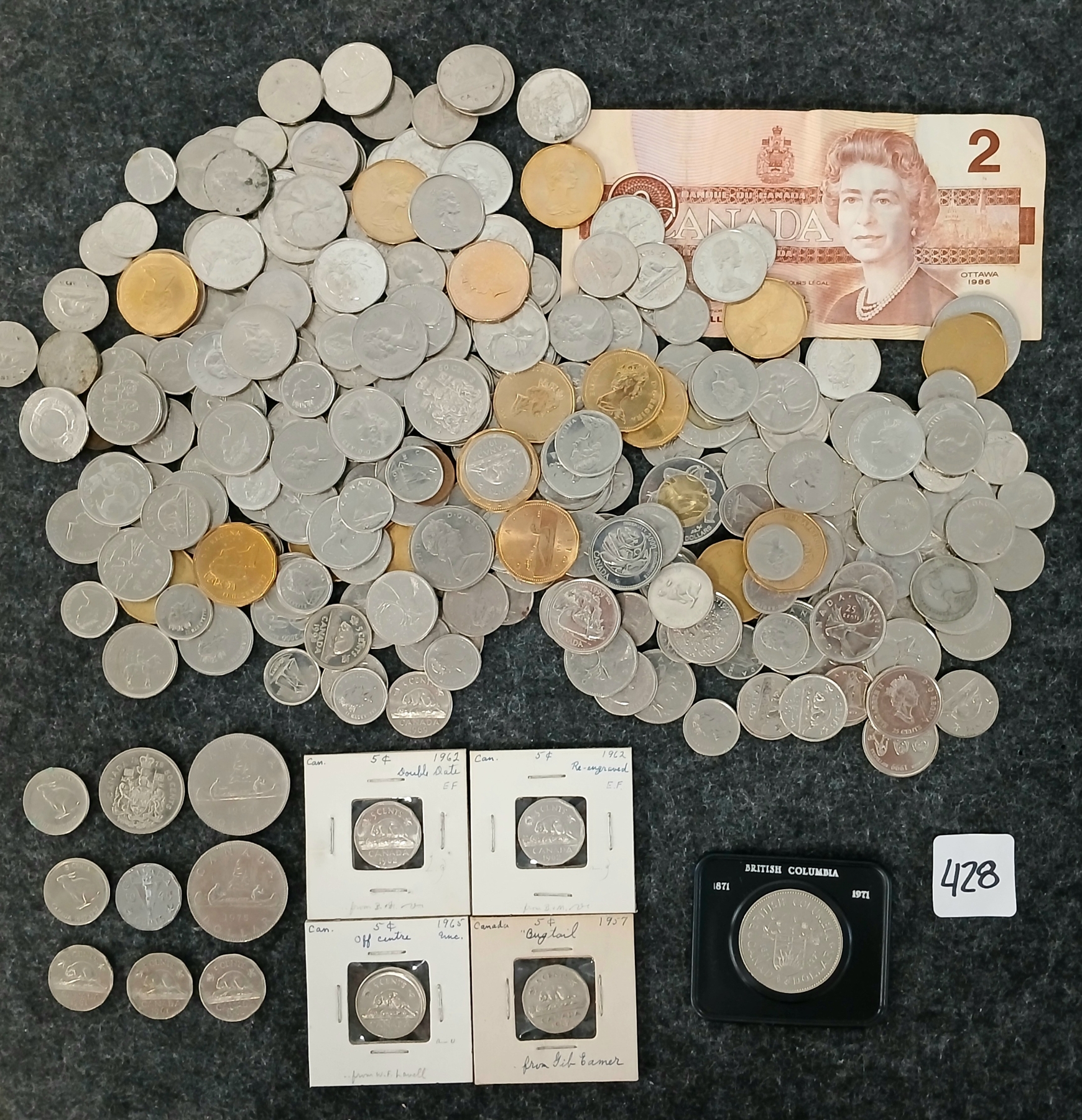 Lot 428 JOB LOT - MIXED YEARS CDN COINS & 1986 CDN $2 BANKNOTE