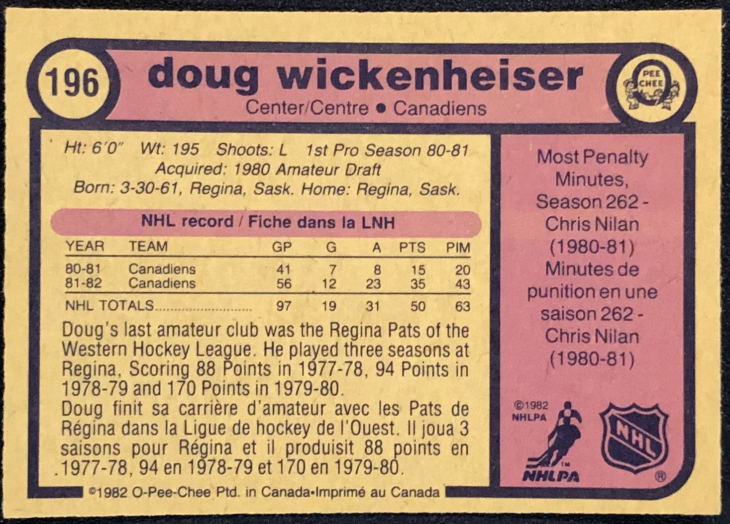 Lot 68 1982-83 O-PEE-CHEE DOUG WICKENHEISER ROOKIE CARD
