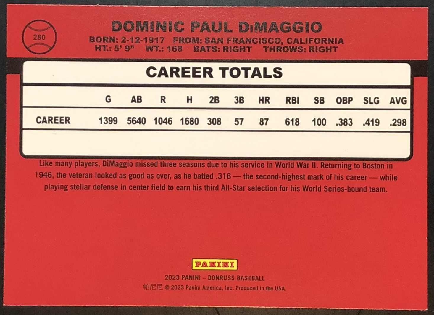 Lot 218 2023 DONRUSS YELLOW PARALLEL RETRO DOM DiMAGGIO