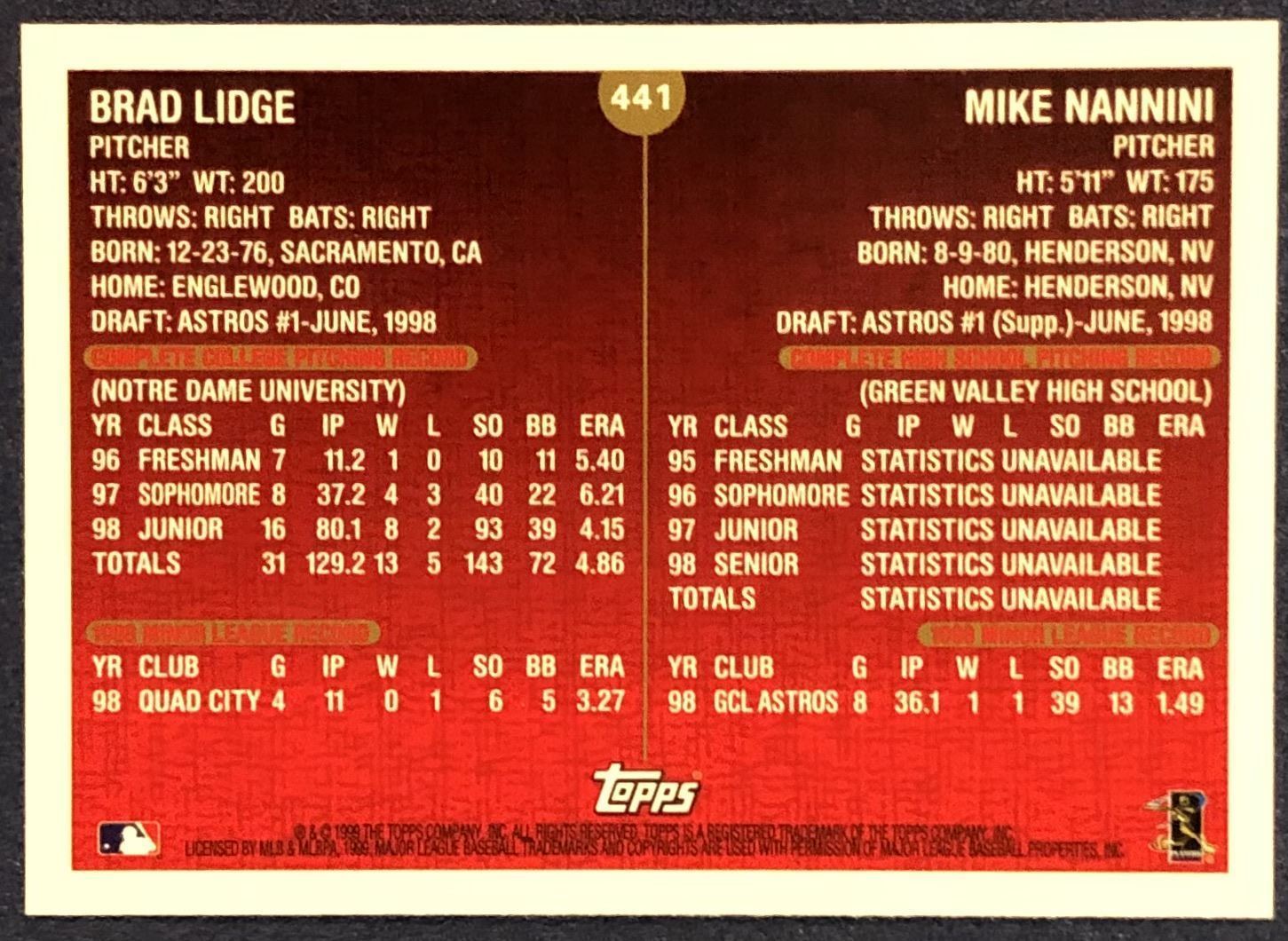 Lot 376 1999 TOPPS BRAD LIDGE ROOKIE CARD