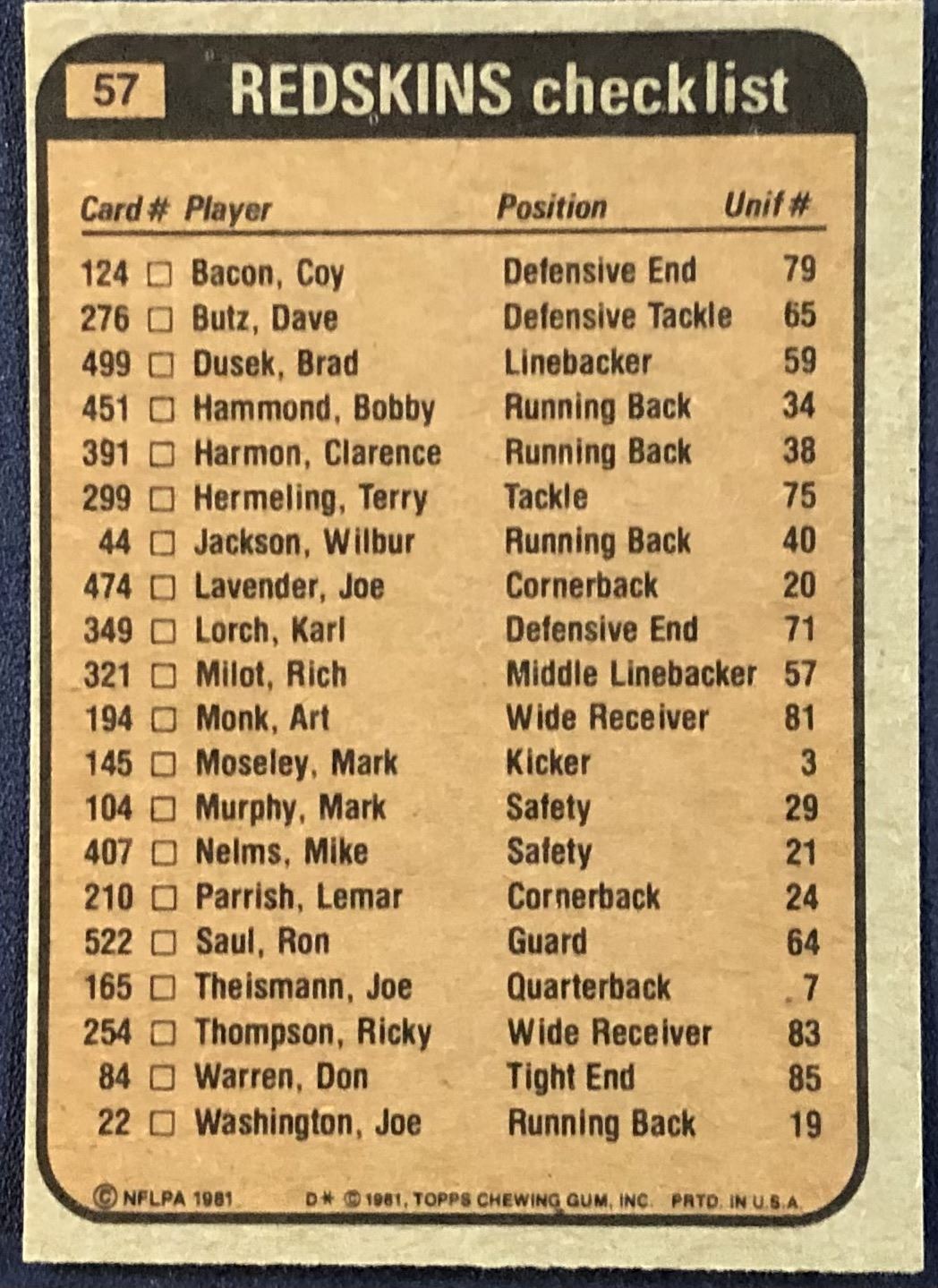 Lot 481 1981 TOPPS NFL ART MONK (HOF)