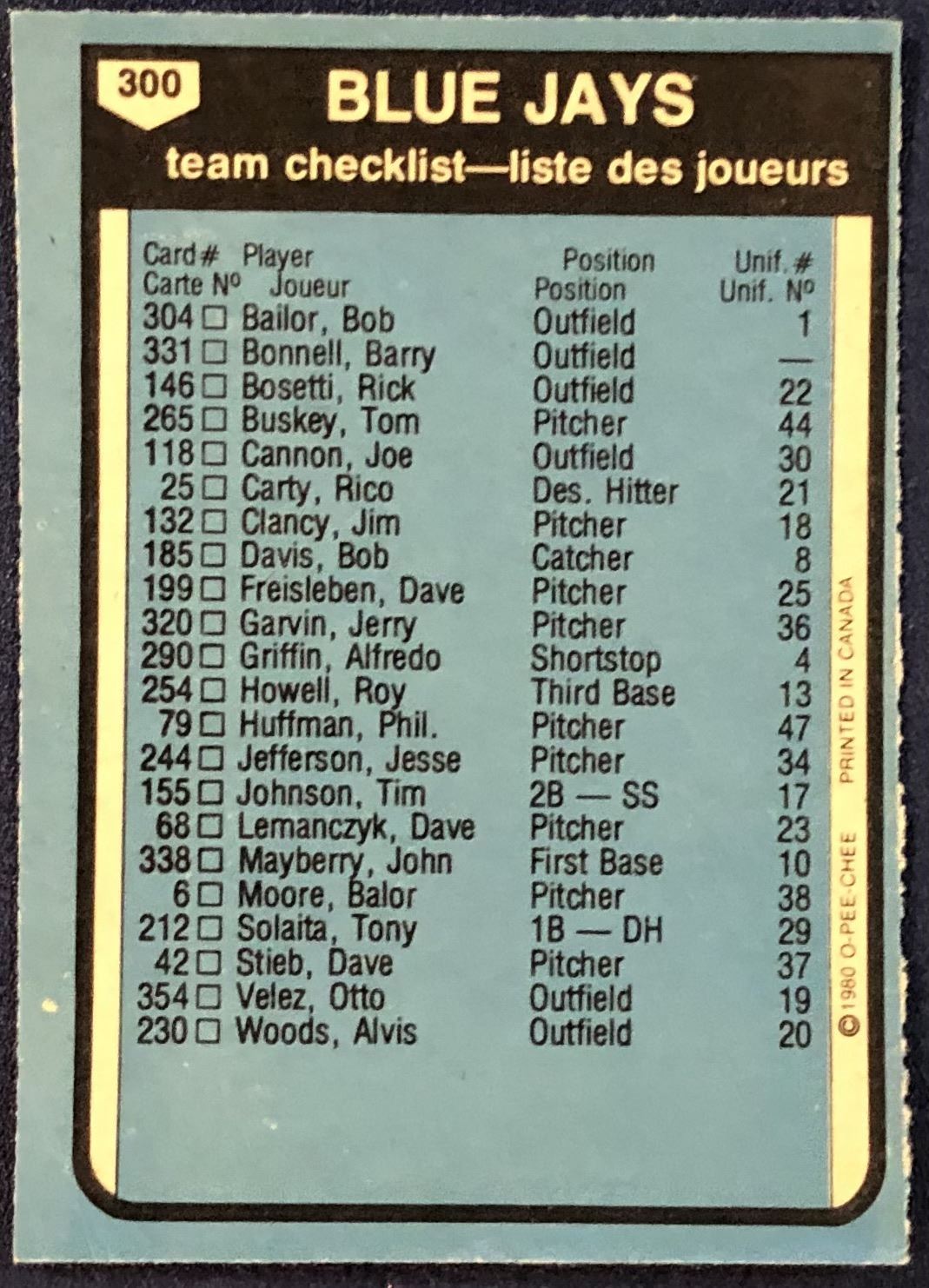 Lot 610 1980 O-PEE-CHEE TORONTO BLUE JAYS