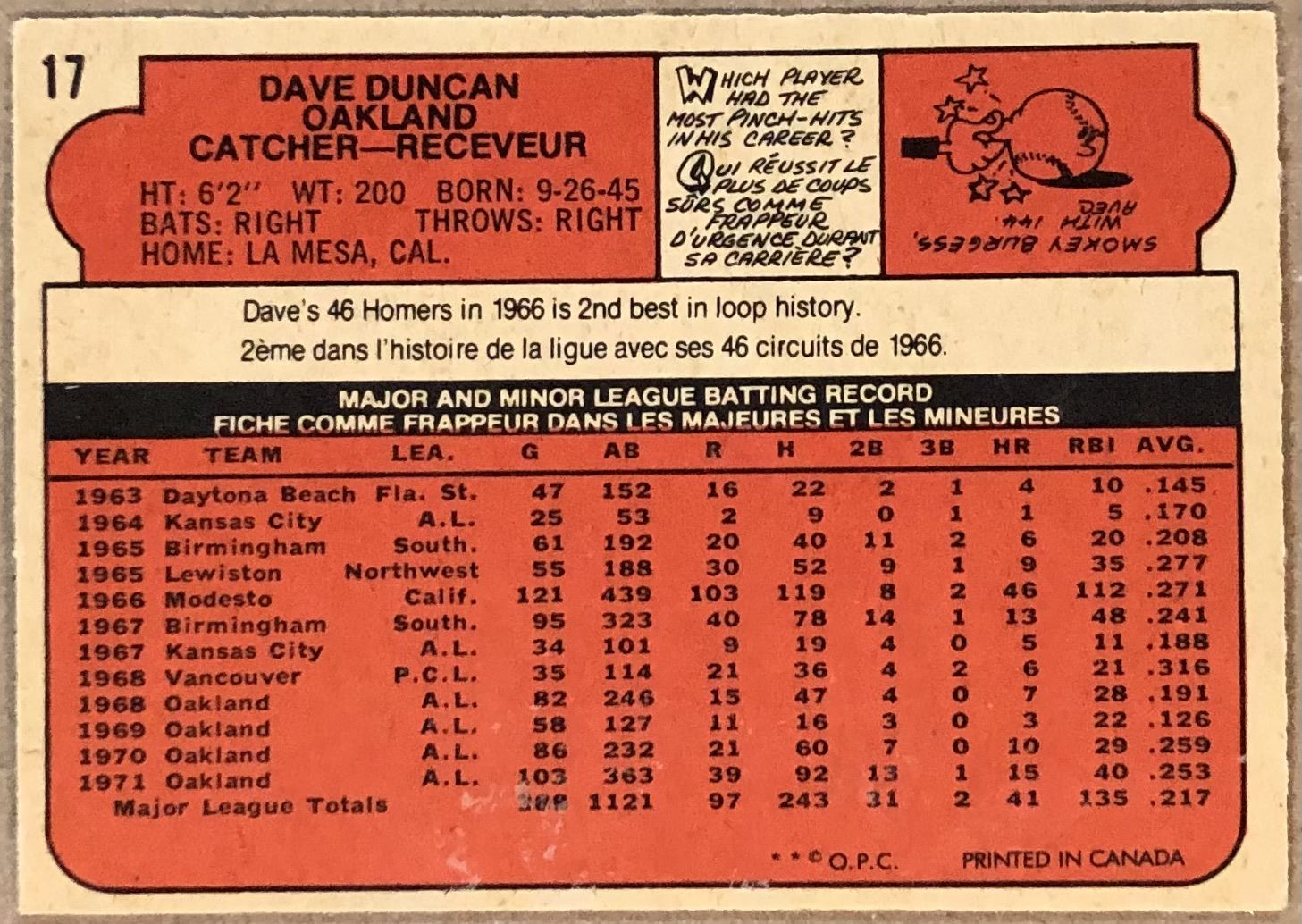 Lot 900 1972 O-PEE-CHEE DAVE DUNCAN