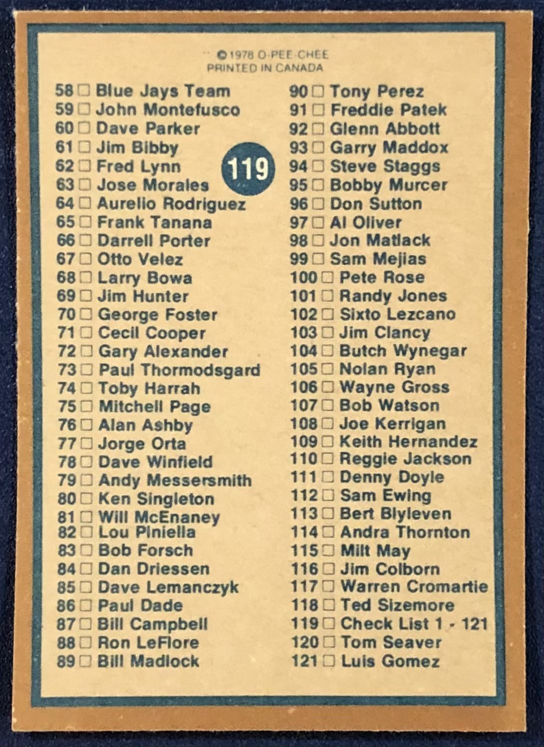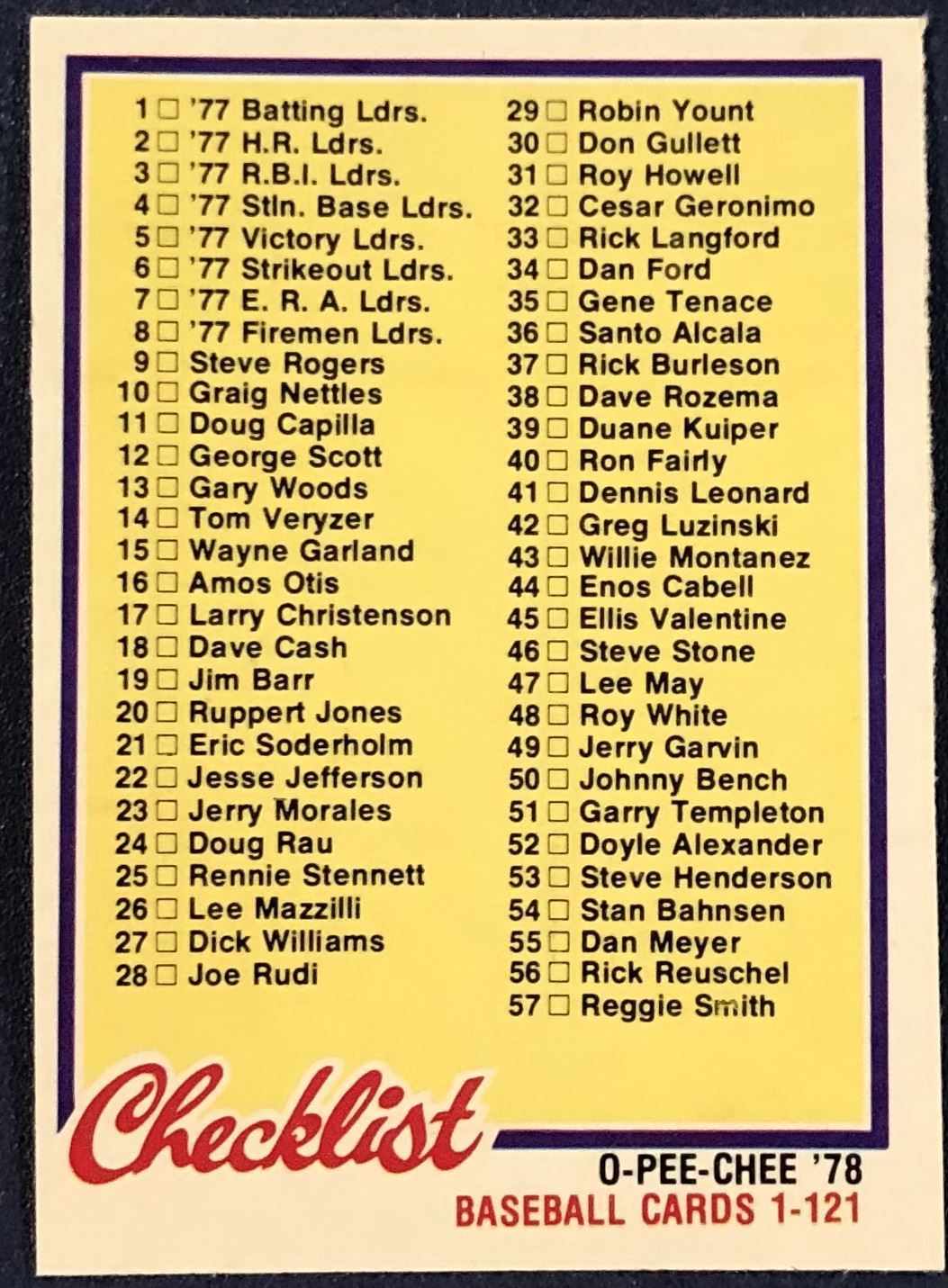 Lot 976 1978 O-PEE-CHEE CHECKLIST
