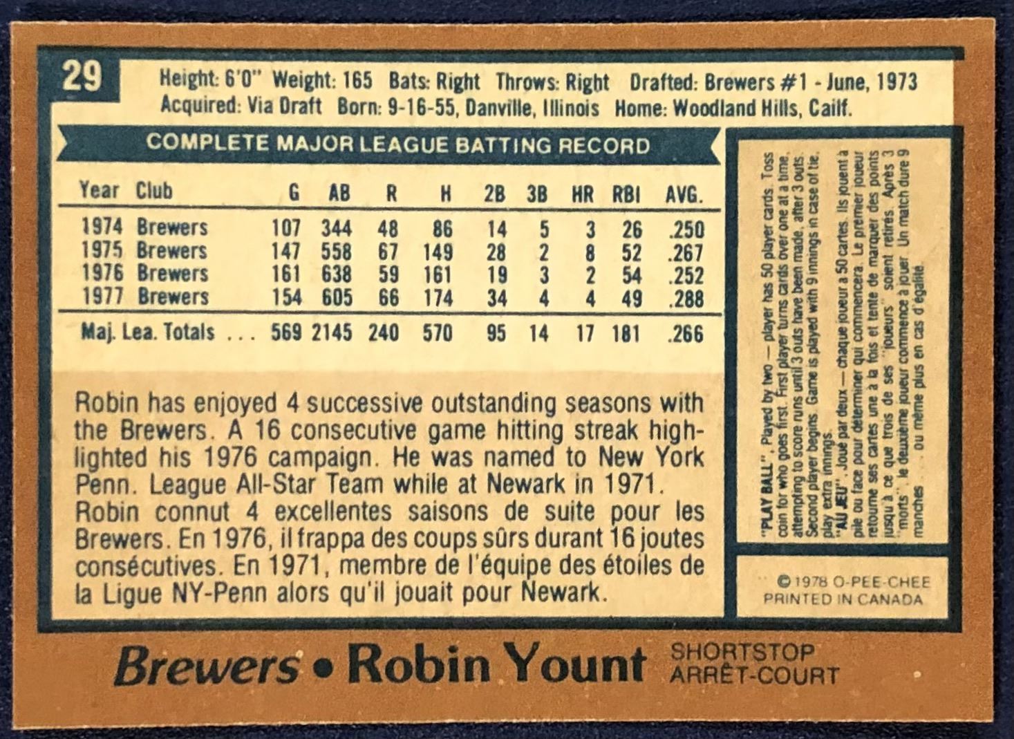 Lot 989 1978 O-PEE-CHEE ROBIN YOUNT (HOF)