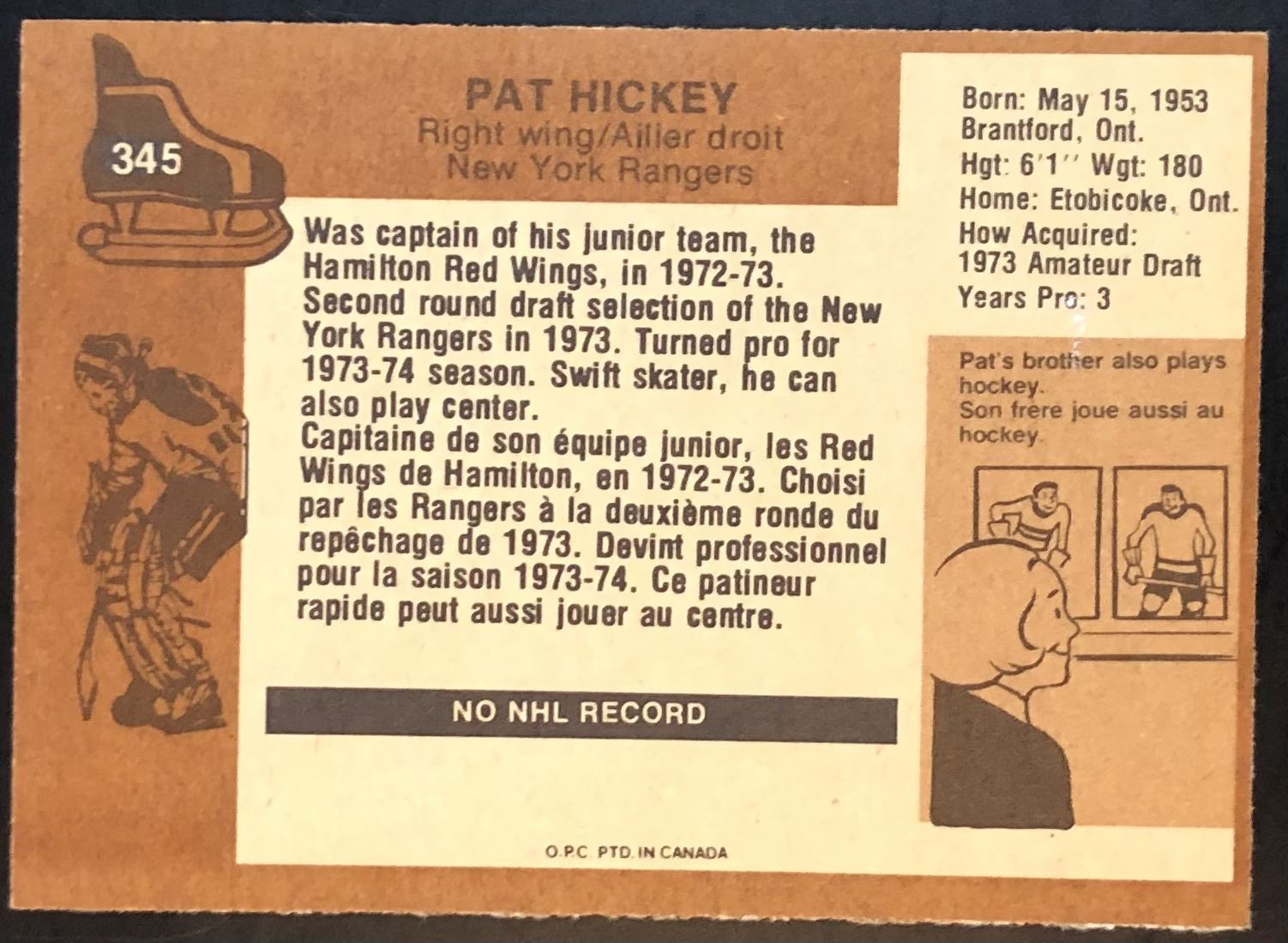 Lot 1050 1975-76 NHL O-PEE-CHEE PAT HICKEY ROOKIE CARD