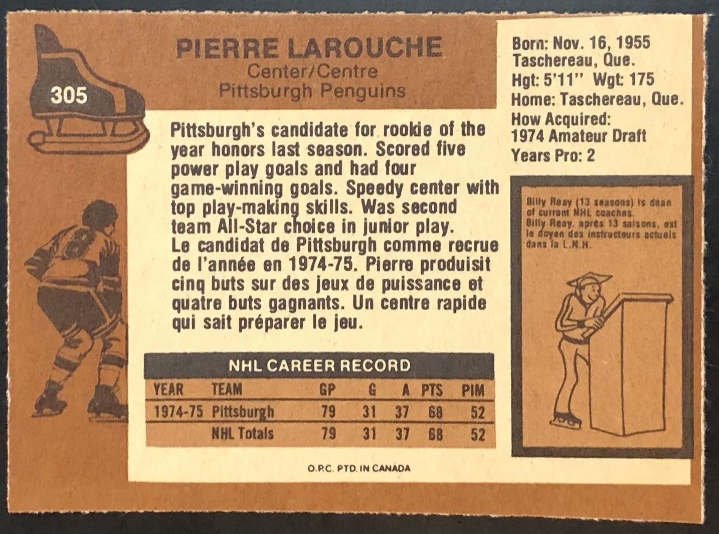 Lot 1067 1975-76 O-PEE-CHEE PIERRE LAROUCHE ROOKIE CARD