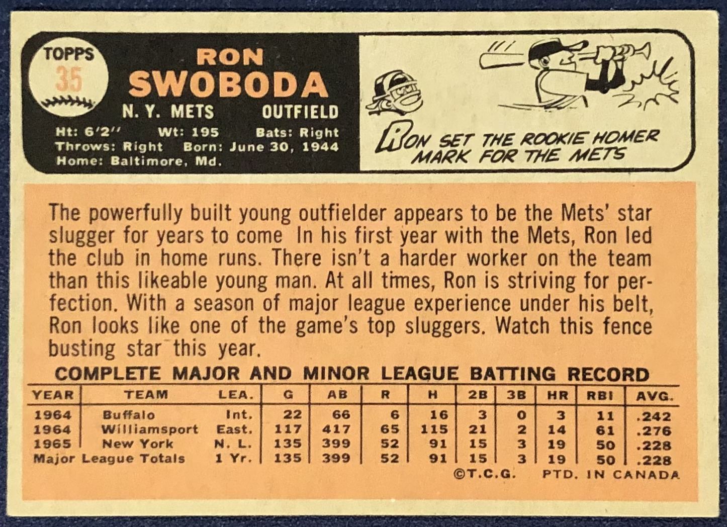 Lot 1251 1966 O-PEE-CHEE RON SWOBODA ROOKIE CARD