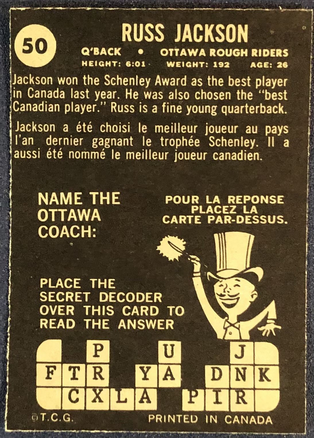 Card #50 vintage, CFL, football, OPC, hall of fame