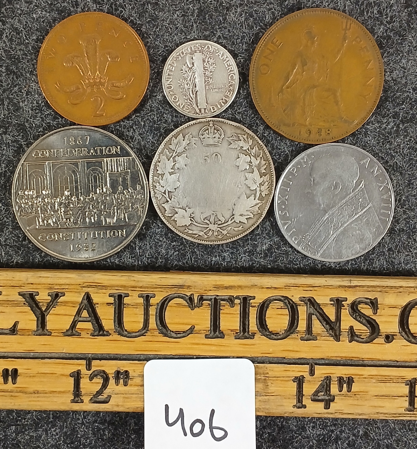 Lot 406 LOT OF 6 - WORLD COINS - INCL 1917 CDN SILVER 50 CENT, 1945 US 10 CENT, ETC