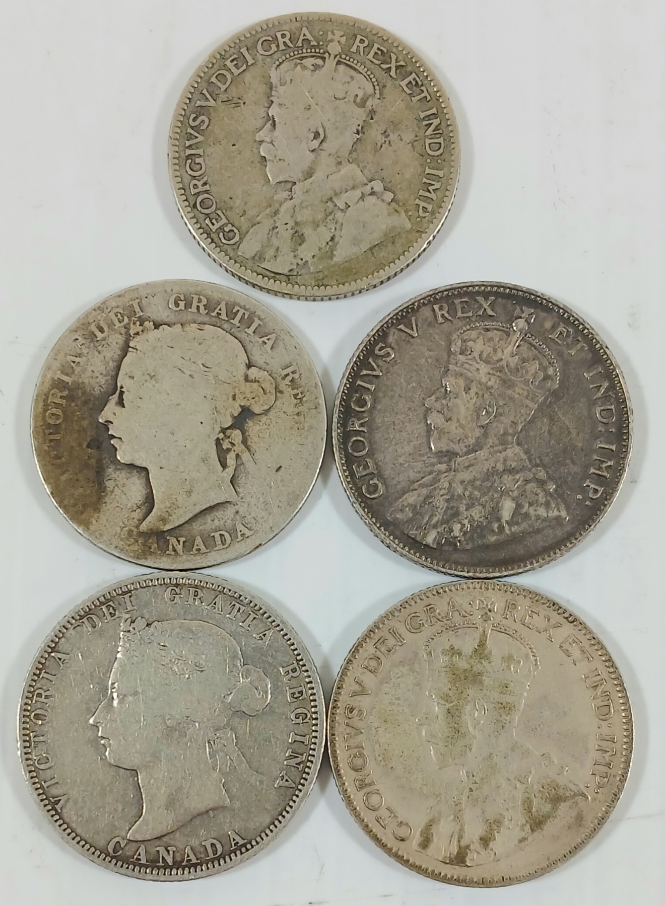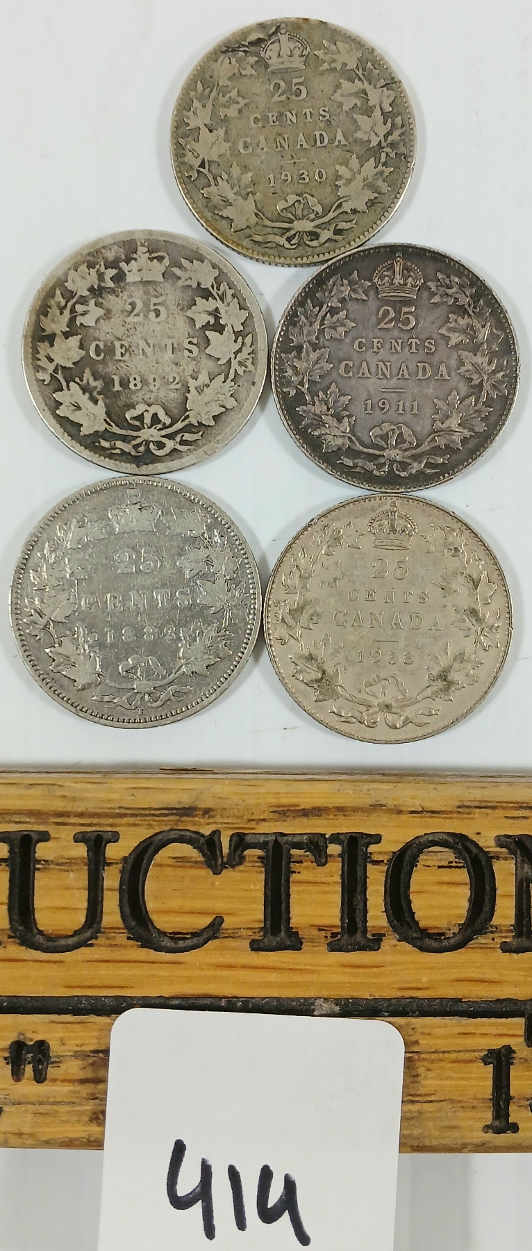 Lot 414 LOT OF 5 - 1882-1933 CDN SILVER 25 CENT COINS