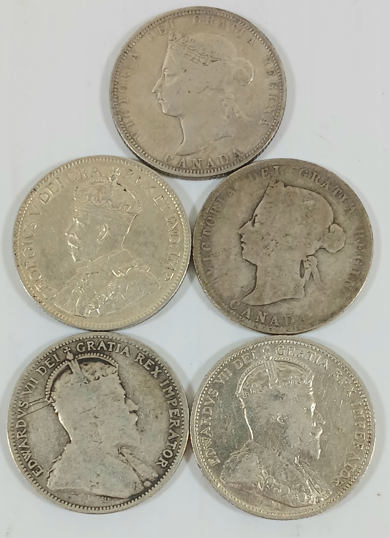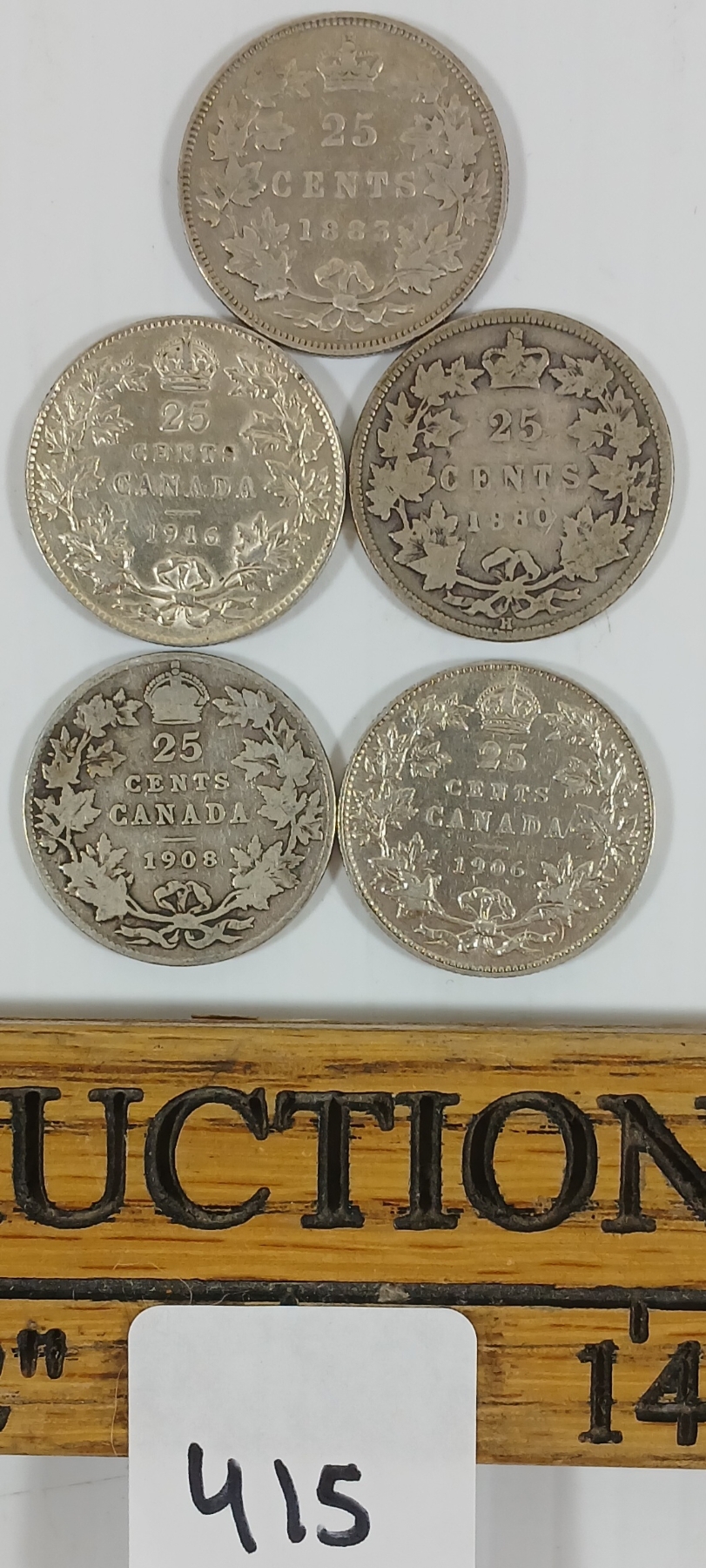 Lot 415 LOT OF 5 - 1880-1916 CDN SILVER 25 CENT COINS