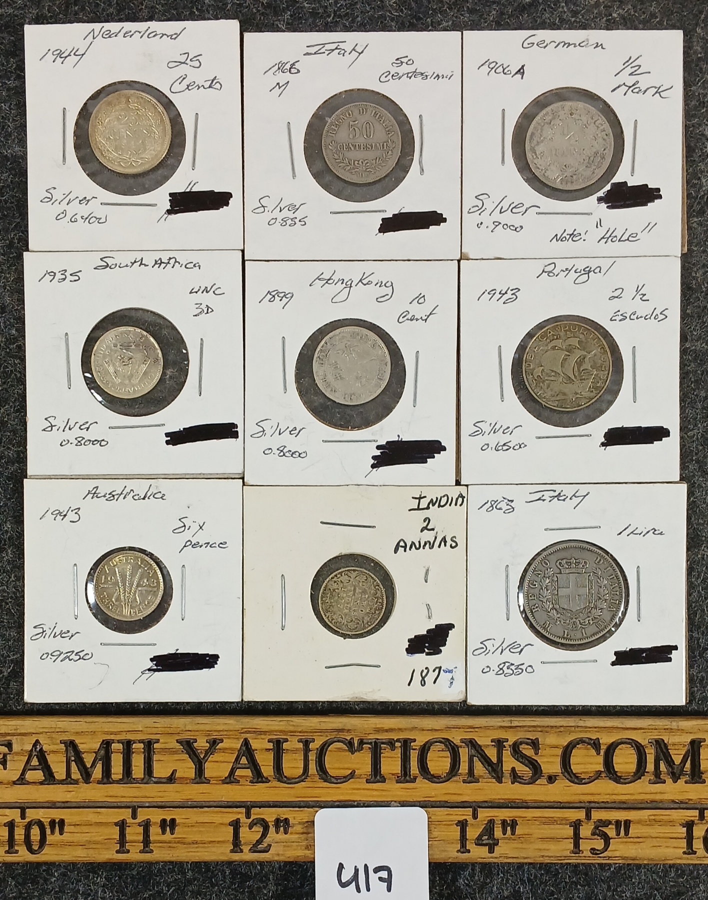 Lot 417 LOT OF 9 - 1866-1944 MISC SILVER WORLD COINS - INCL AUSTRALIA, GERMAN, ITALY, ETC