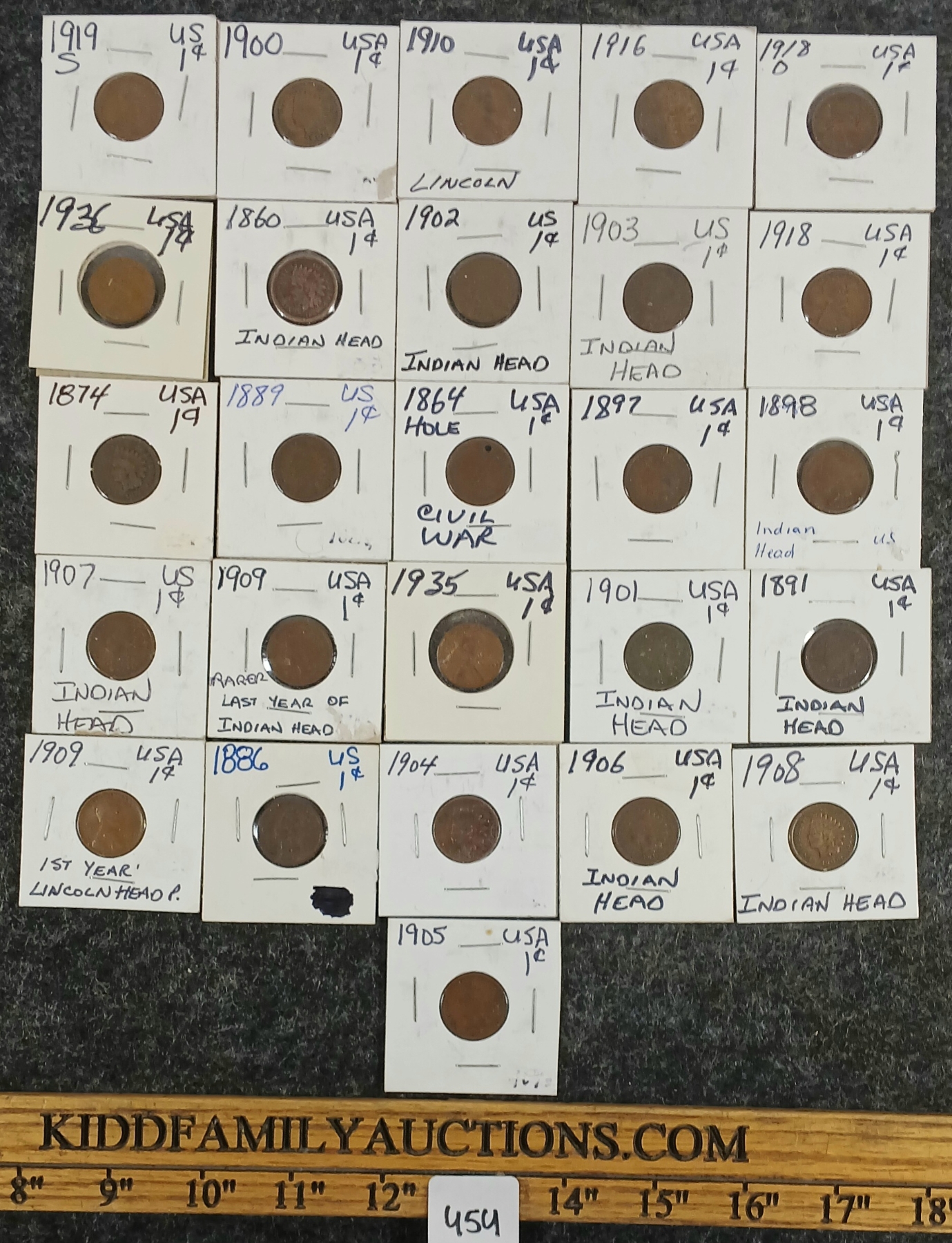 Lot 454 LOT OF 26 - 1860-1936 US 1 CENT COINS - INCL CIVIL WAR & INDIAN HEAD