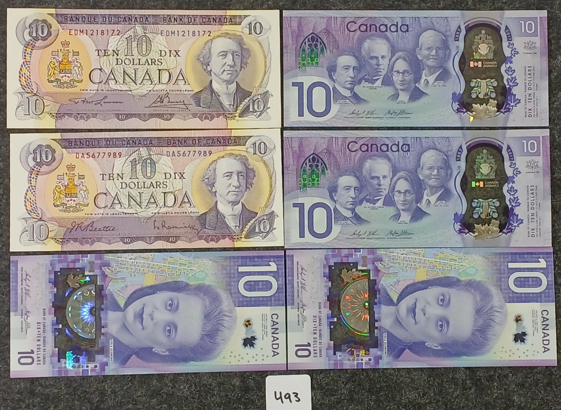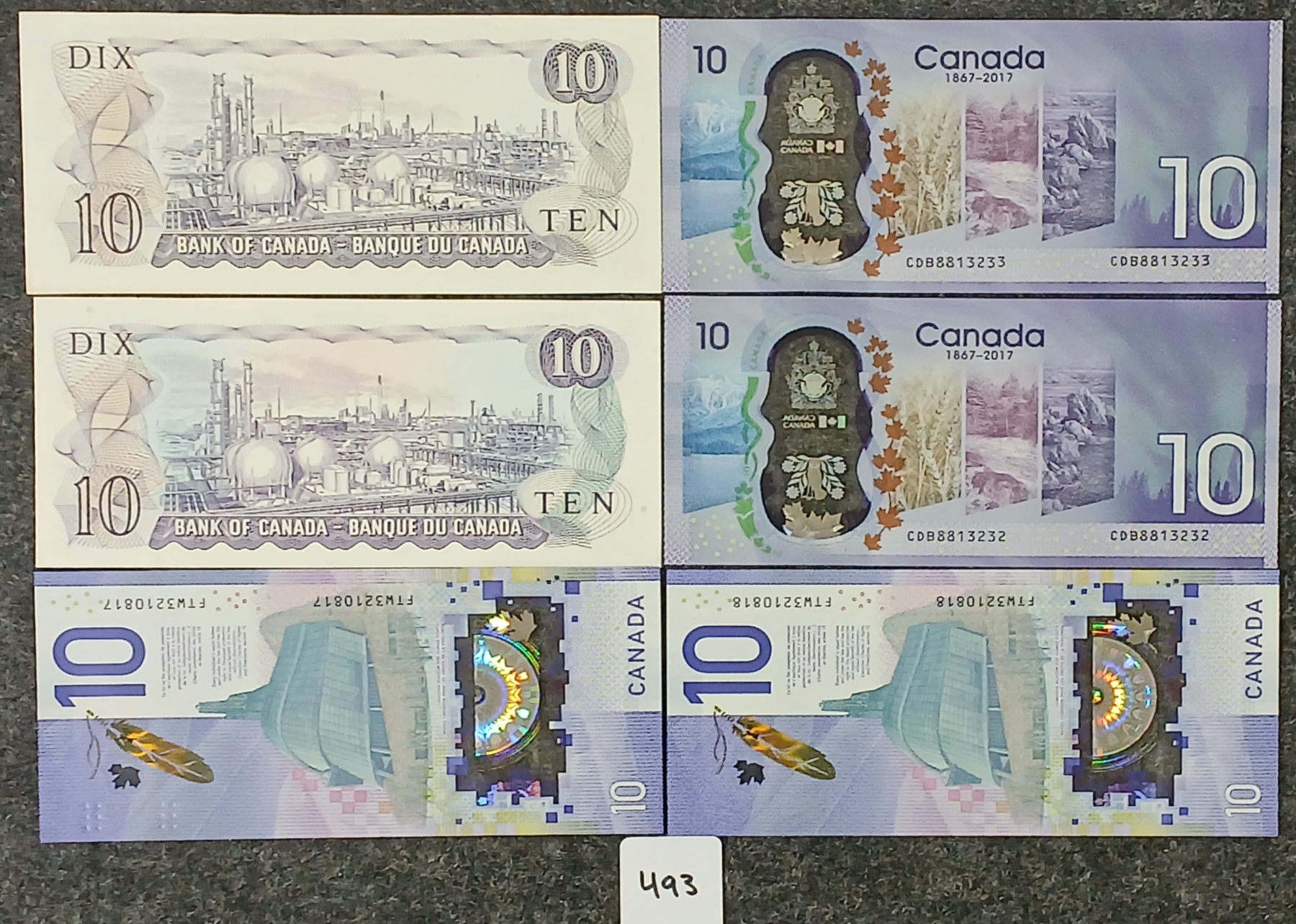 Lot 493 LOT OF 6 - 1971-2018 CDN $10 BANKNOTES - INCL UNCIRCULATED & CONSECUTIVE