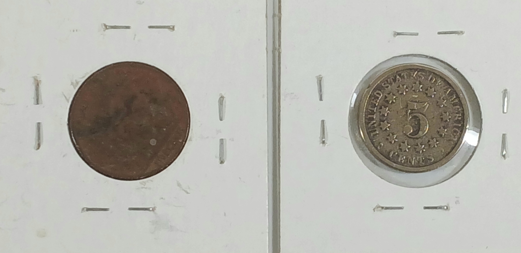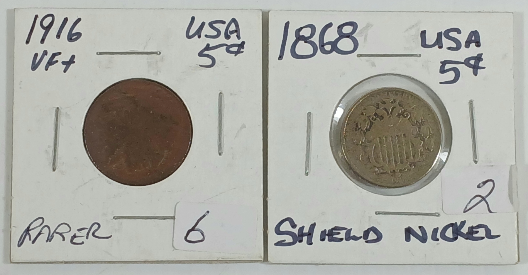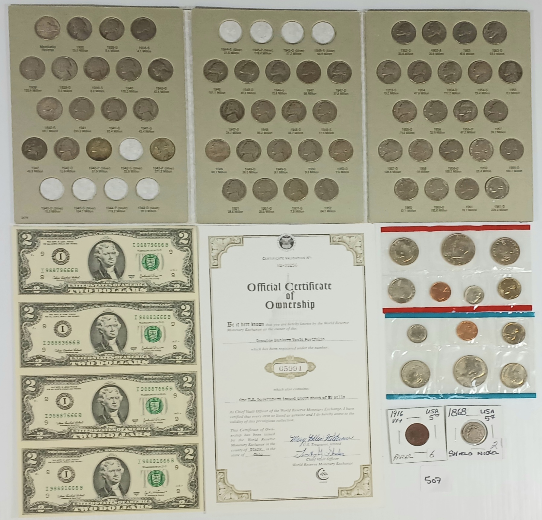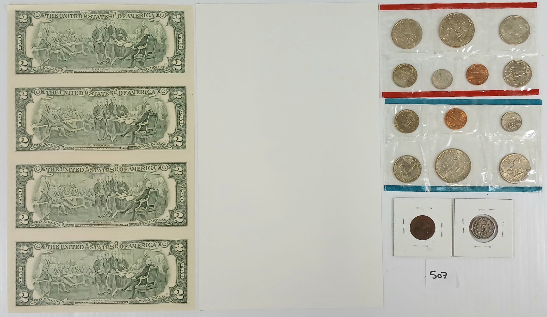 Lot 507 QTY OF US COINS & UNCUT $2 BANKNOTE SHEET - INCL 1868 & 1916 5 CENT PCS