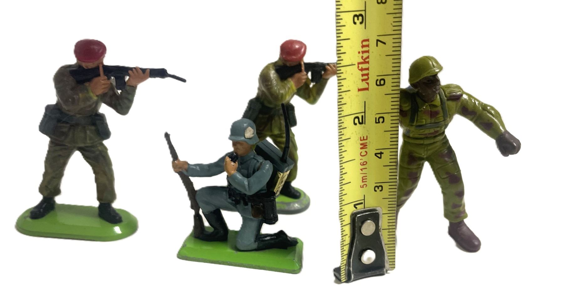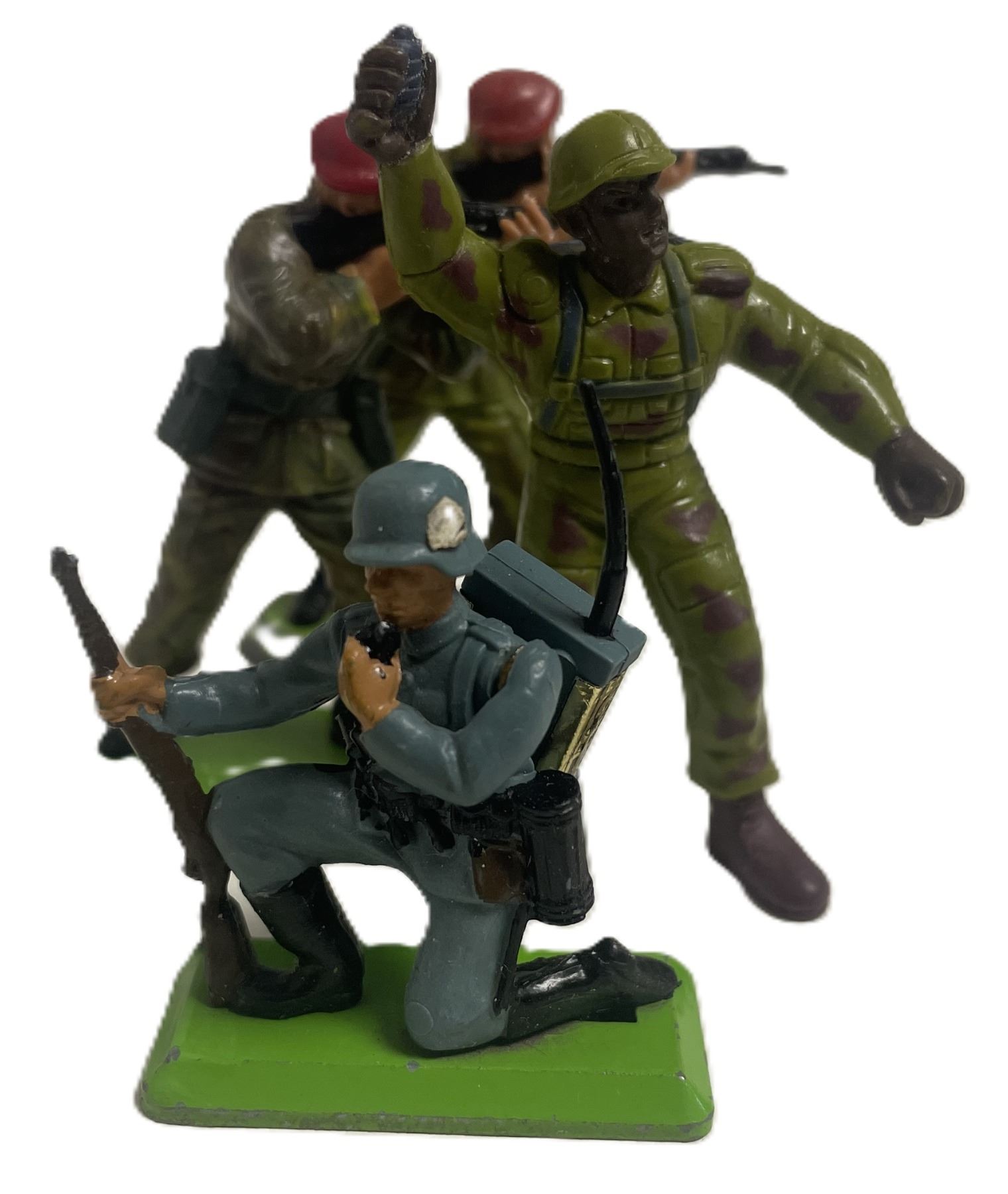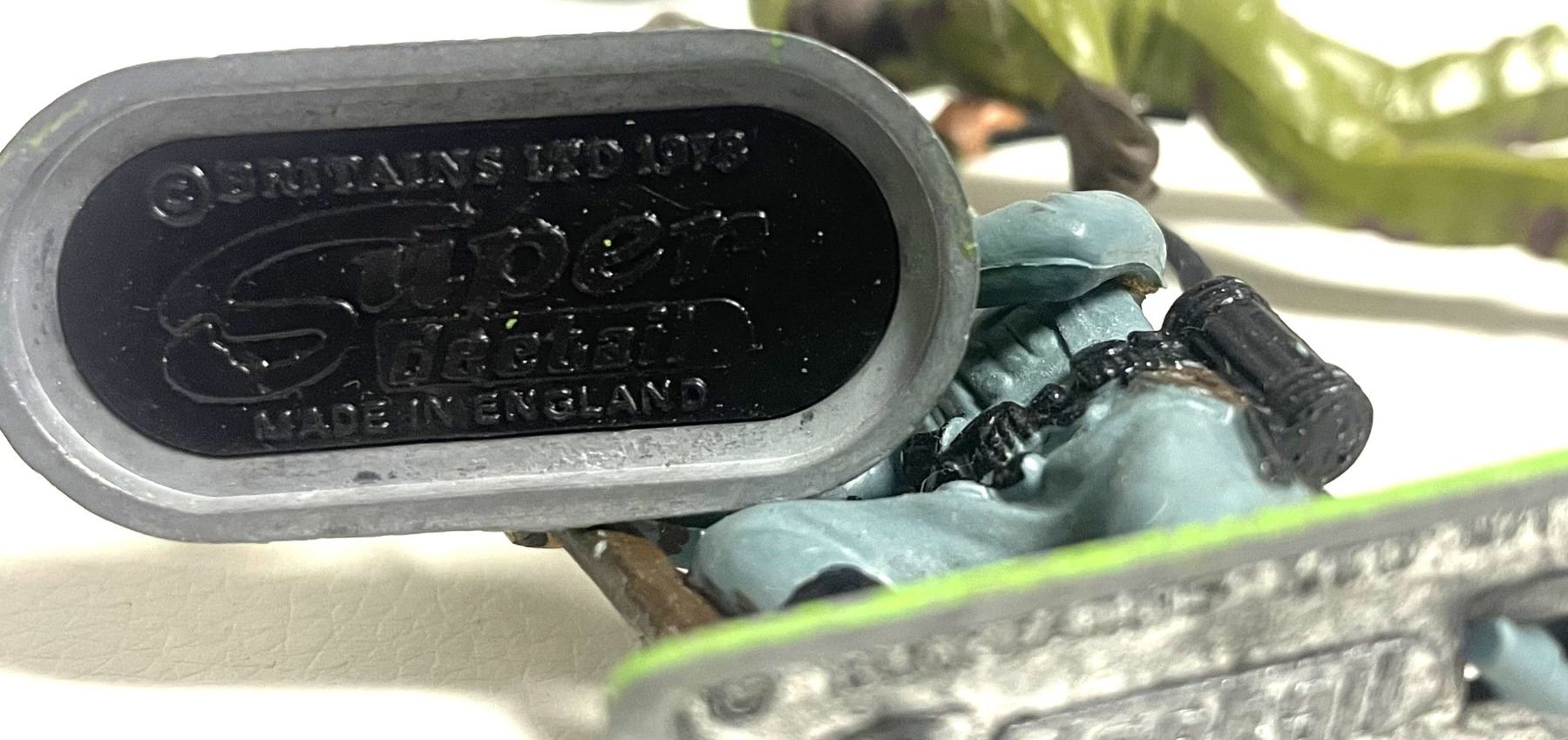 Unique Construction: The figures were made from PVC plastic (unlike earlier polythene models) and featured plug-in arms. They were attached to the metal base via "footlugs," which are the two grey plastic pegs visible through the slots in your image.