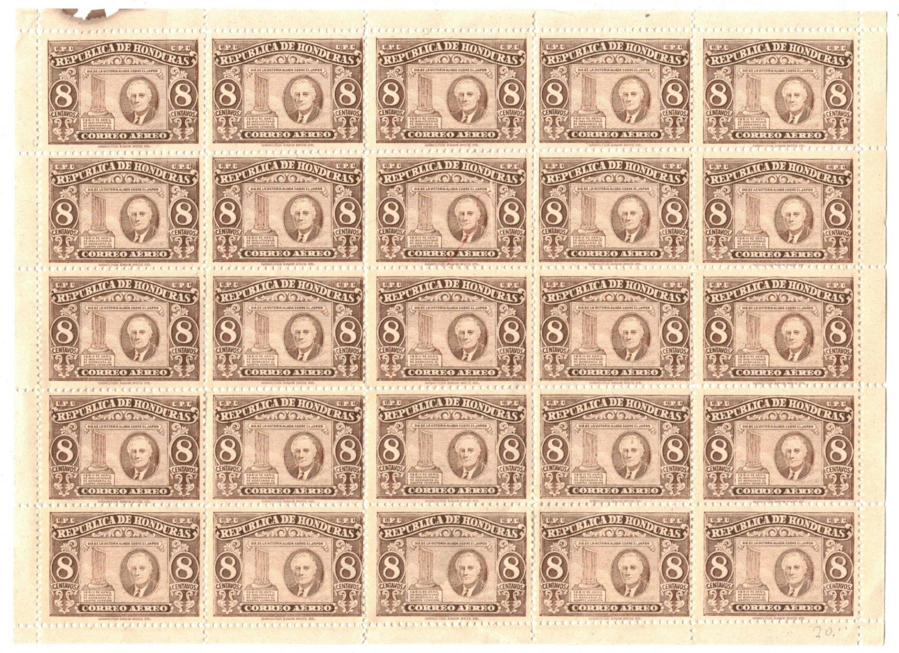 Lot 51 sheet of 25 Honduras postage stamps featuring Franklin D. Roosevelt