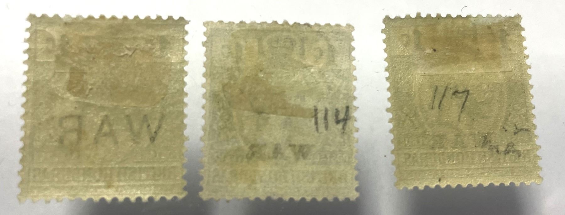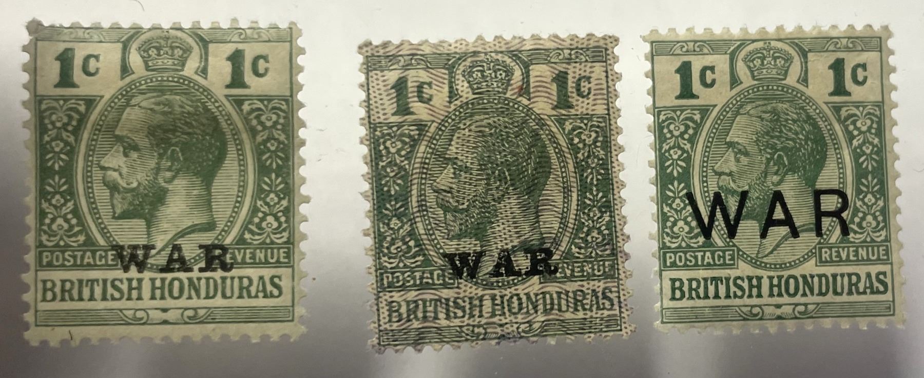 vintage 1-cent postage stamps from British Honduras (now Belize), featuring a "WAR" overprint, commonly known to collectors as "War Tax" stamps issued around 1916–1918.
