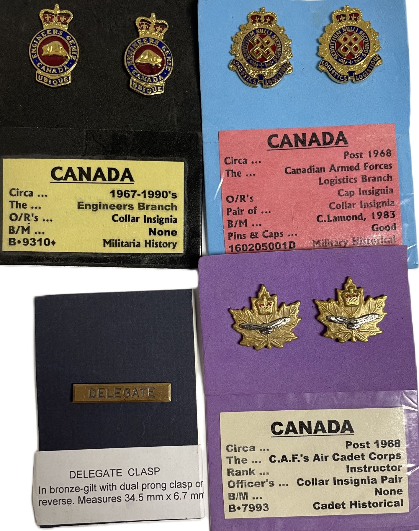 collection of Canadian military insignia and badges, including Engineers Branch collar insignia, Logistics Branch cap insignia, an Air Cadet Corps instructor insignia pair, and a Delegate clasp