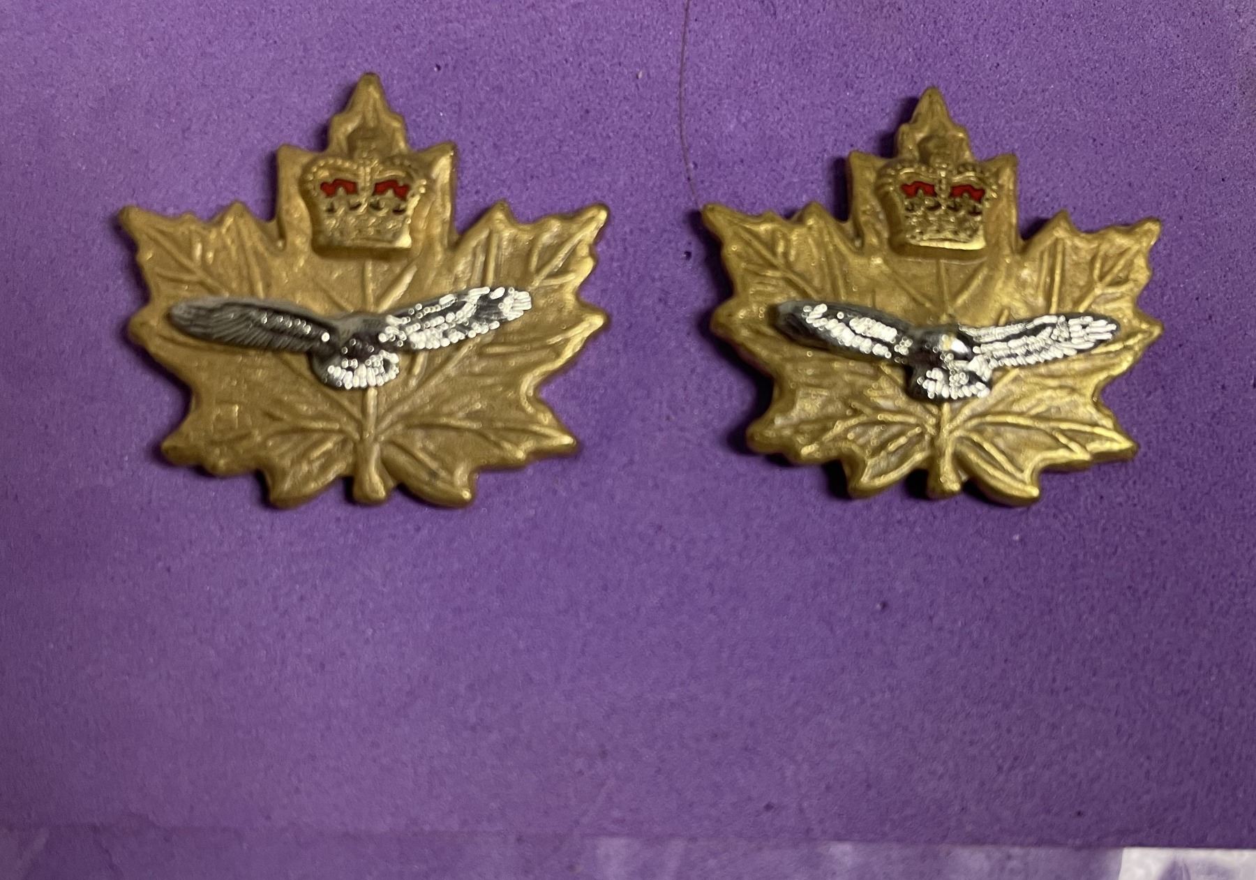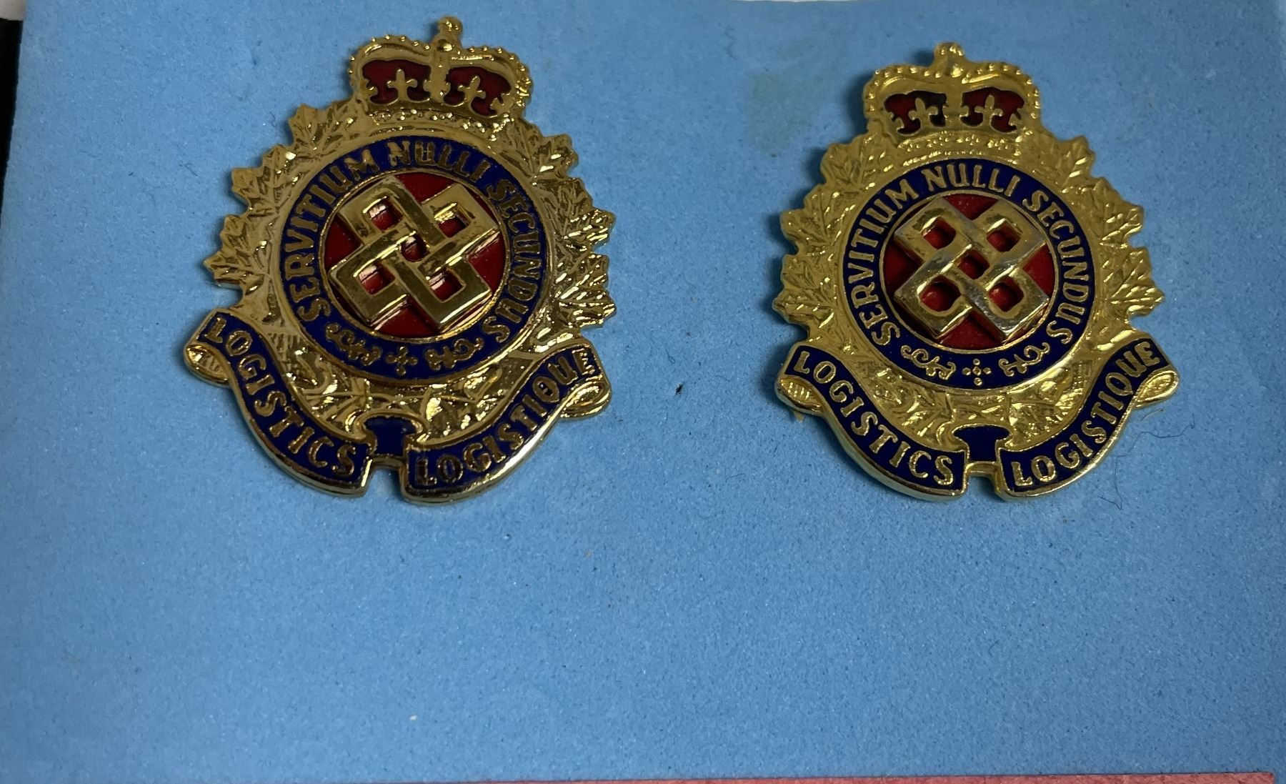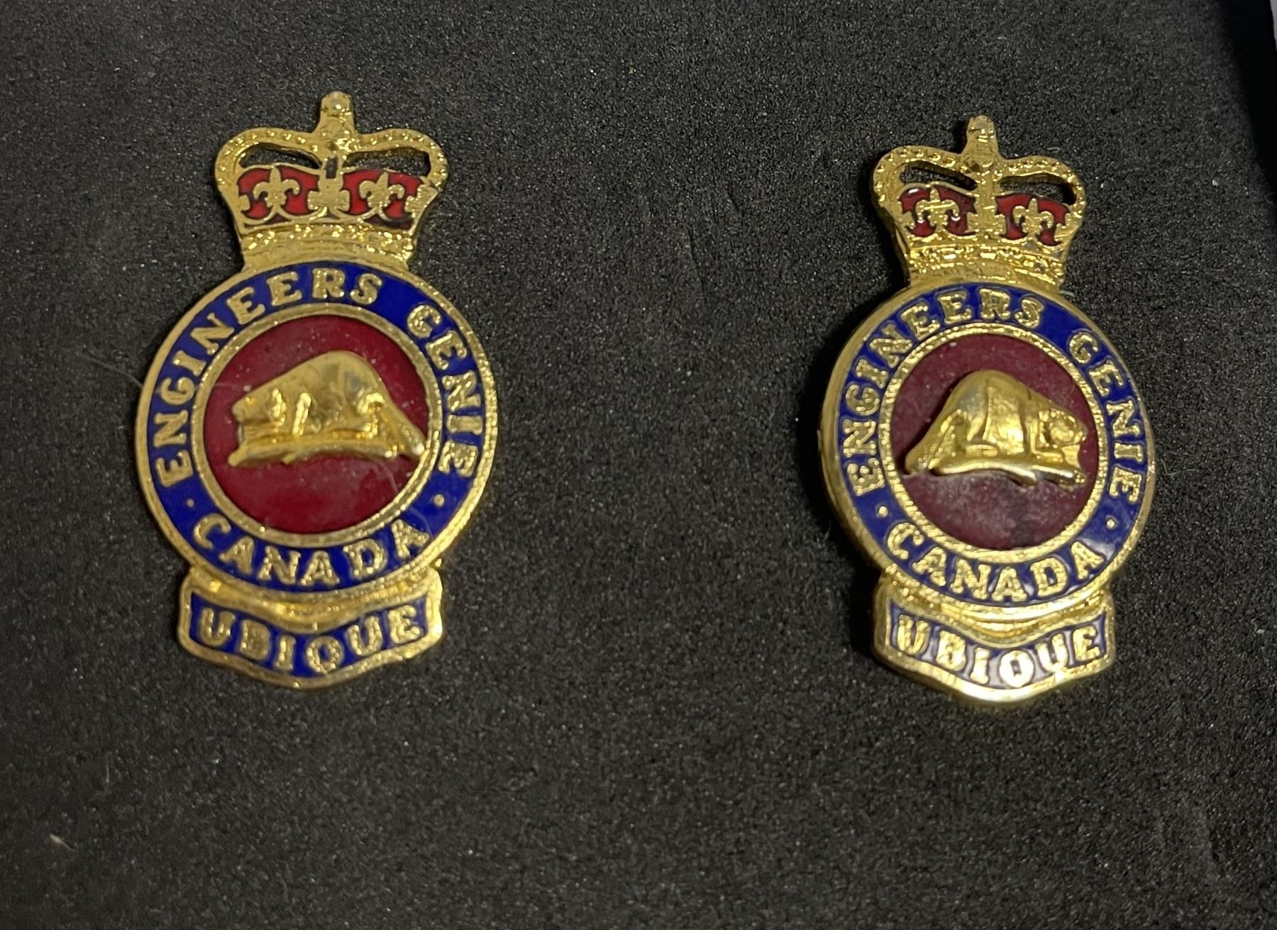 Lot 114 Engineers Branch collar insignia, Logistics Branch cap insignia, an Air Cadet Corps instructor
