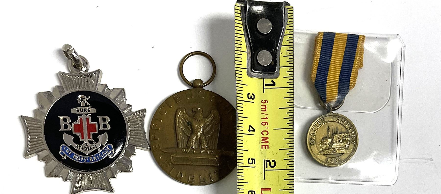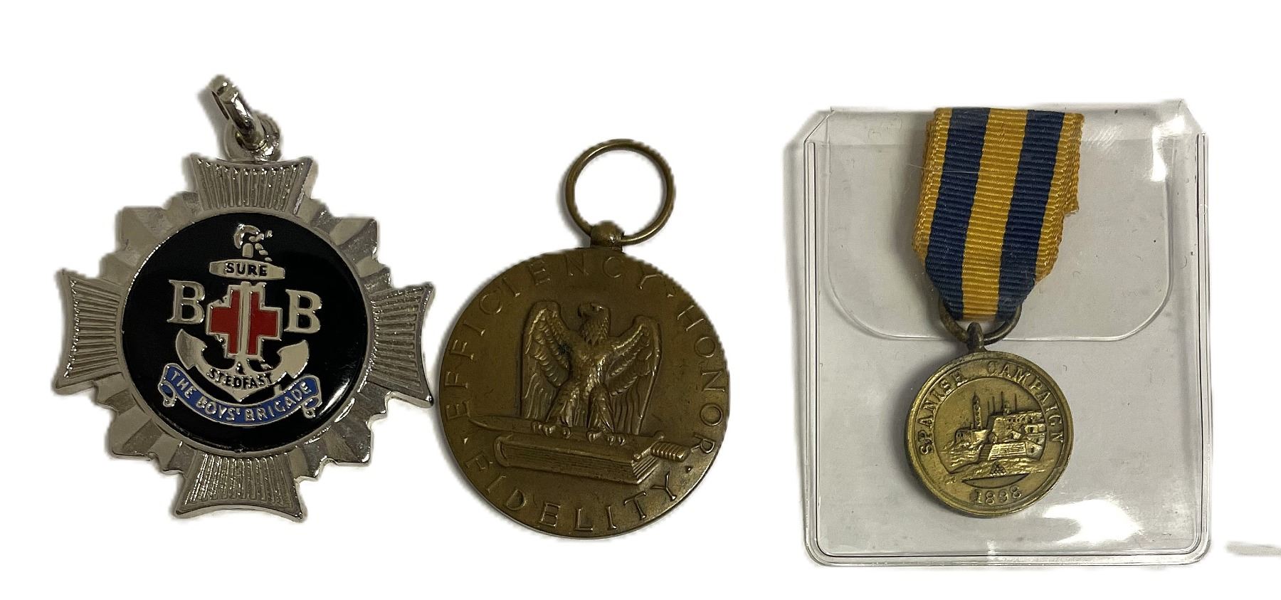 Left Item: This is a Boys' Brigade Squad Medal. The Boys' Brigade (B.B.) is an international interdenominational Christian youth organization. The medal features their distinctive anchor and cross emblem with the letters "B B" and the motto "Sure & Stedfast".