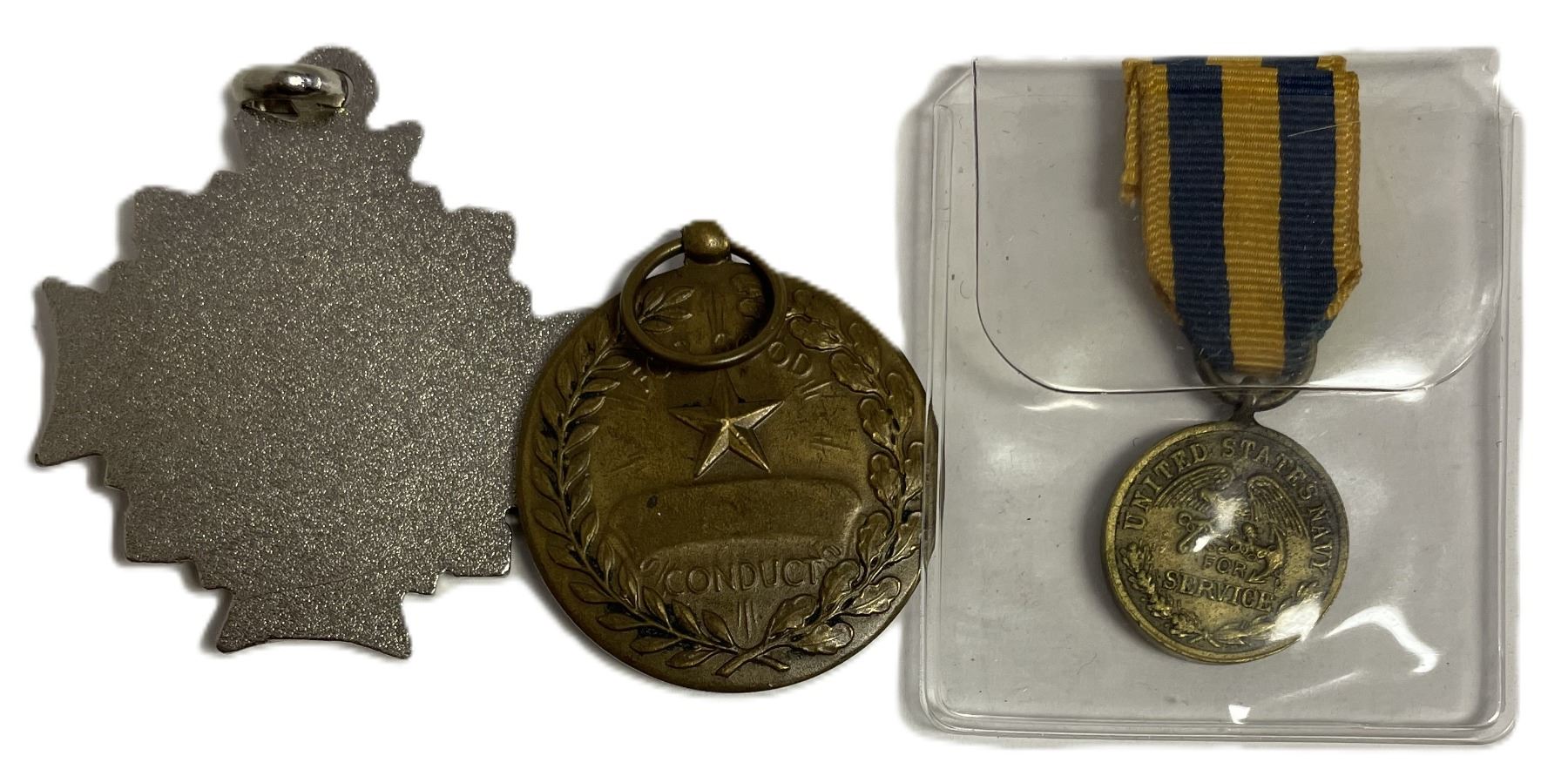 Middle Item: This medal appears consistent with the Maritime War Cross (1940-1945) from Greece. It was instituted during WWII and awarded in three classes (Commander, Gold Cross, and Silver Cross) to military personnel or civilians for outstanding service.