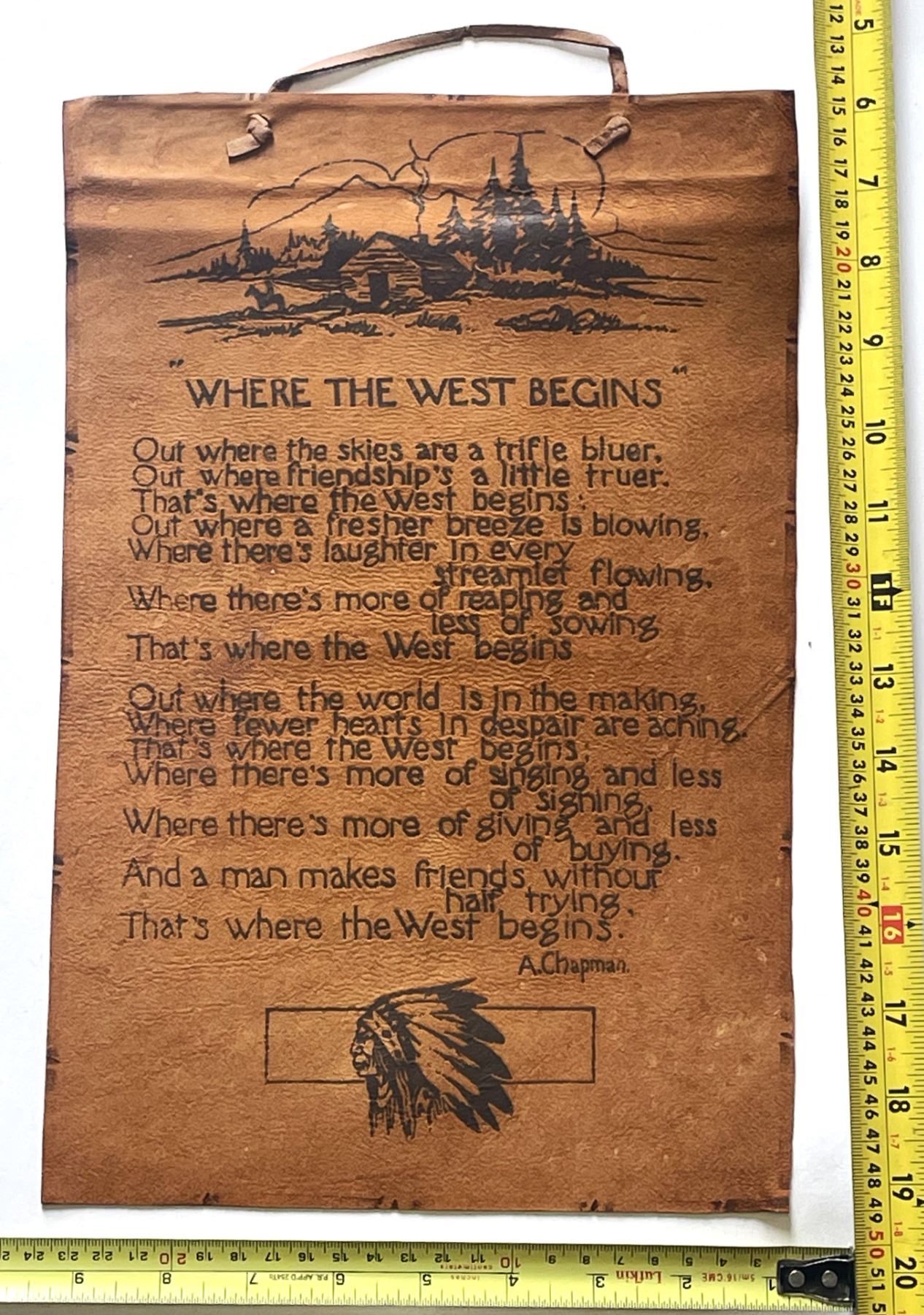 Lot 157 vintage leather hanging wall plaque features the poem "Where the West Begins" by Arthur Chapman.