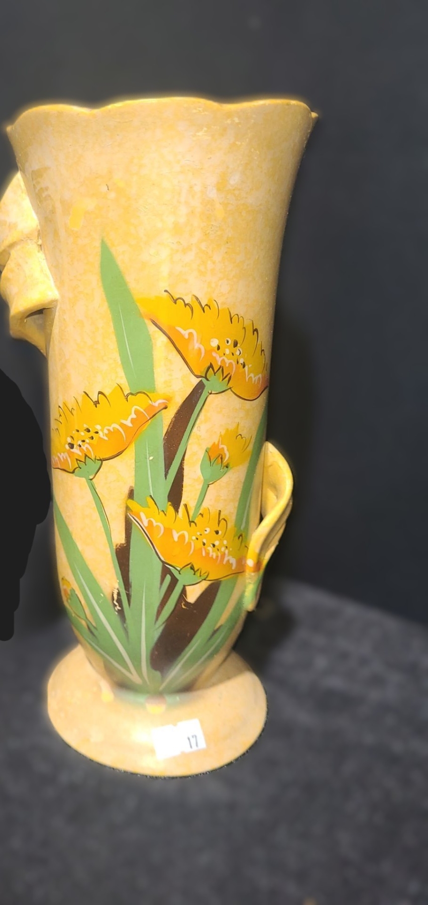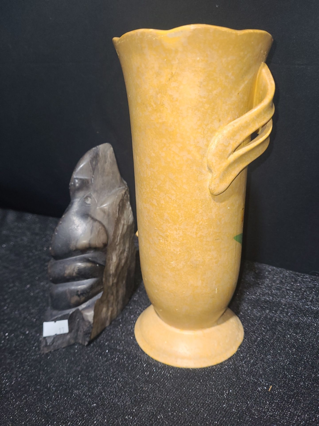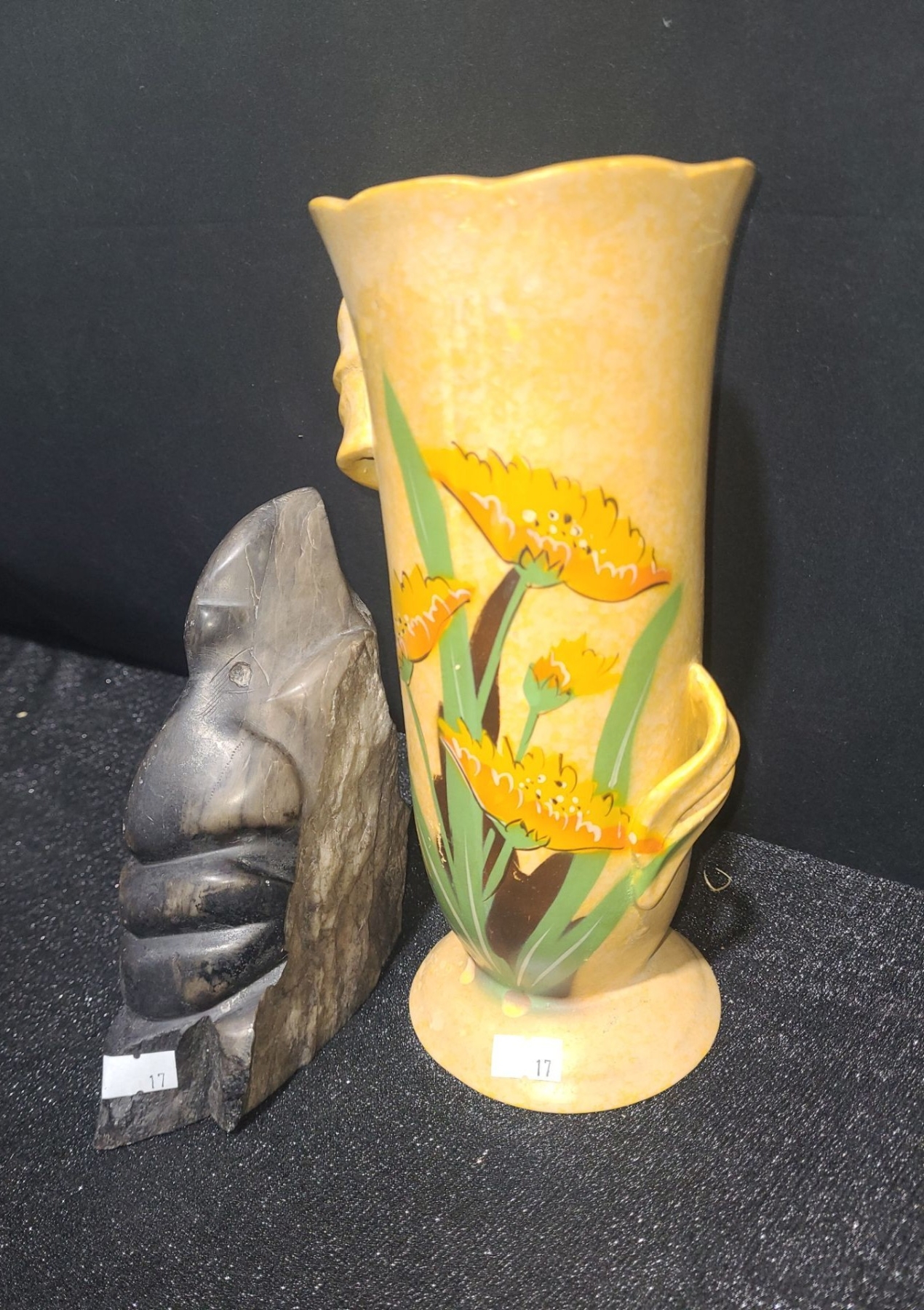 Lot 17 Soapstone Carved Face 2.5 W, 5 D, 7 T and Yellow Vase w/ Painted Flowers 4" Base, 10 T