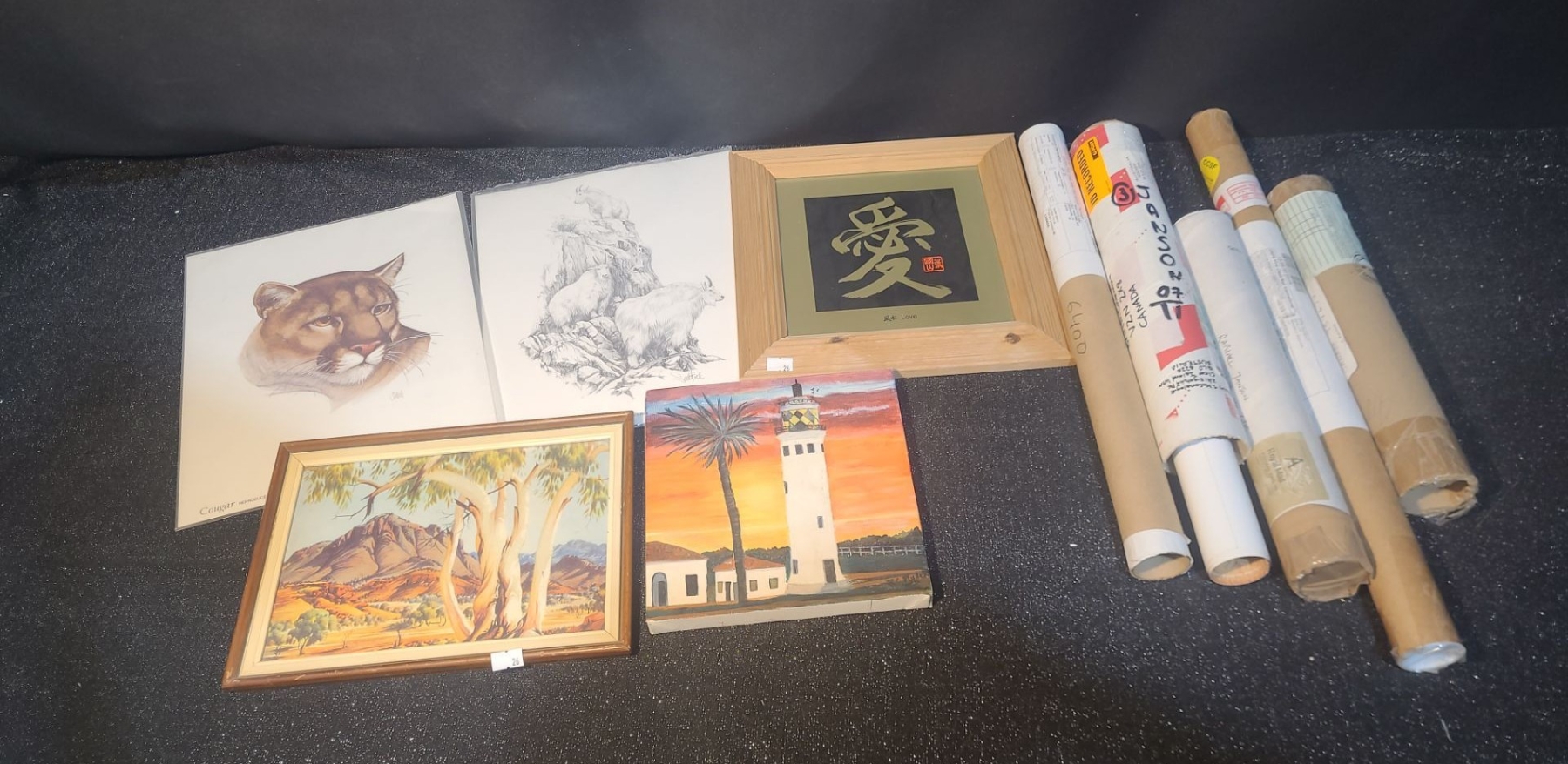 Teddy Poster 24 X 18, Nude 16 X 11.5, Nude w/ Flower 10.5 X 15, Lighthouse 8 X 8, Small Maps 9.5 X 12 and 9.5 X 6.5, Print 11 X 8- Some Art Was Rolled, Condition Issues as Shown