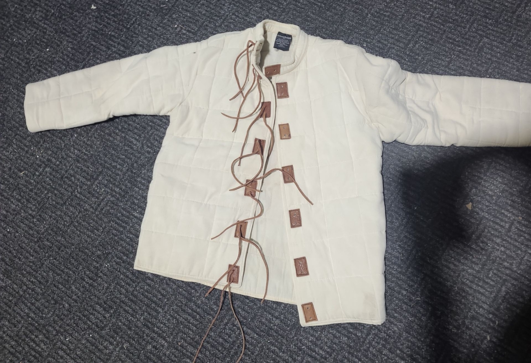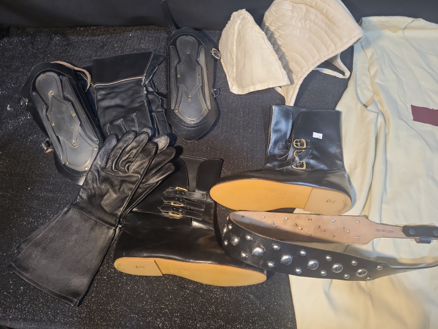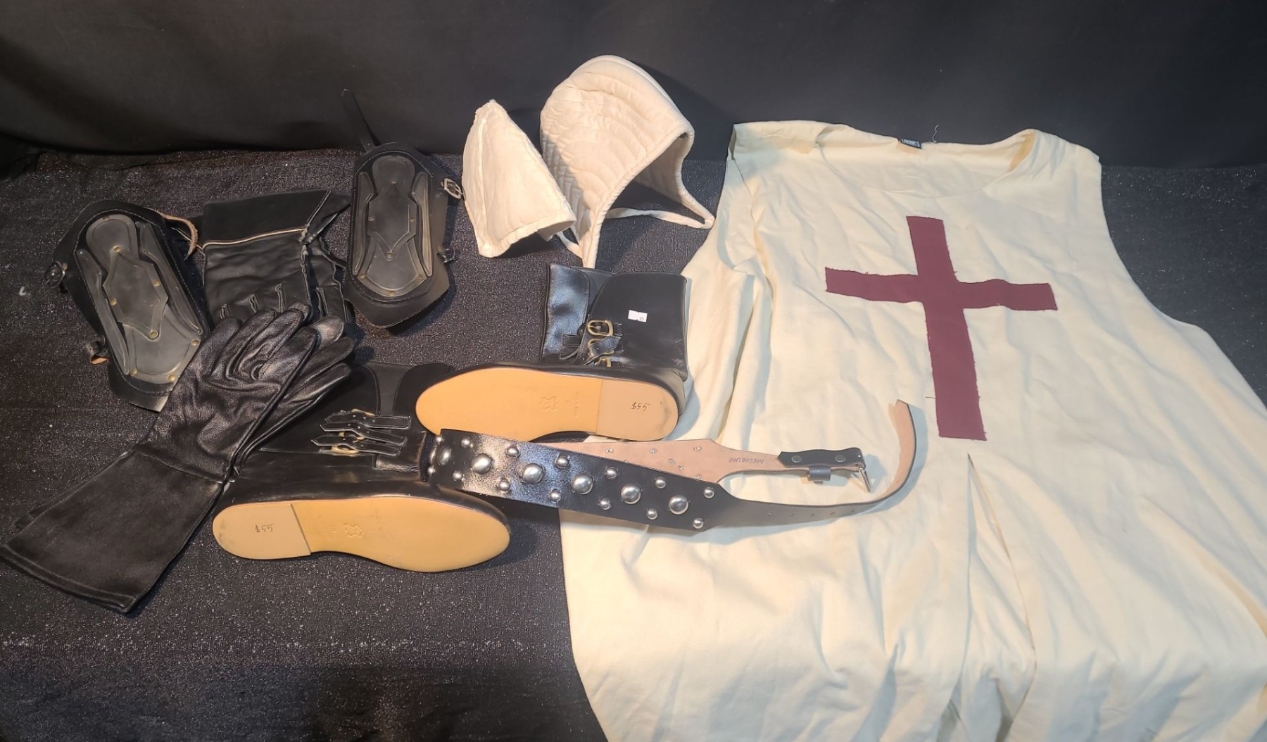 Lot 27 Paramount Costume: Chainmail Top, Robes, Boots/ 10, Belt/ Medium, Quilted Coat XL- See Description