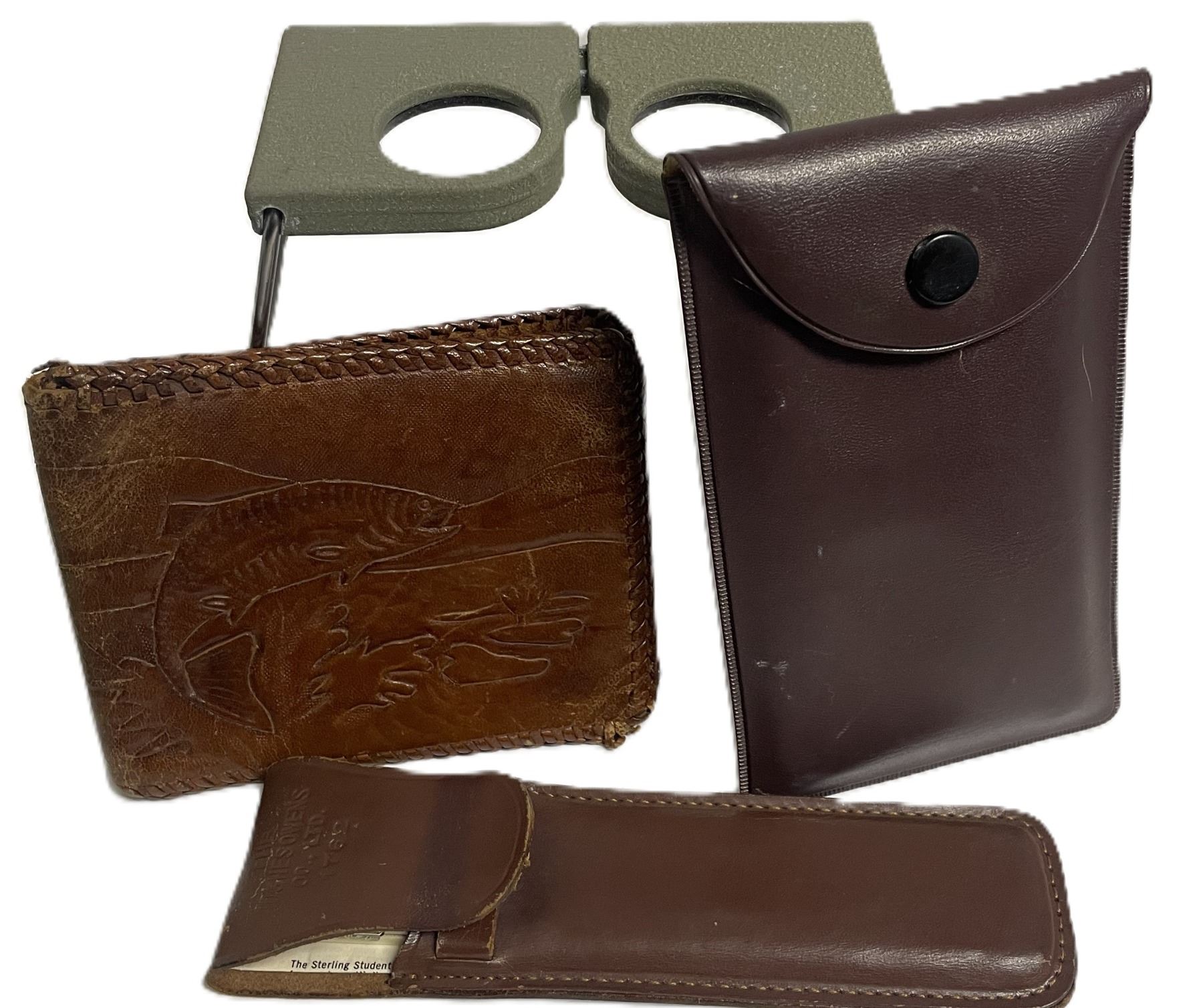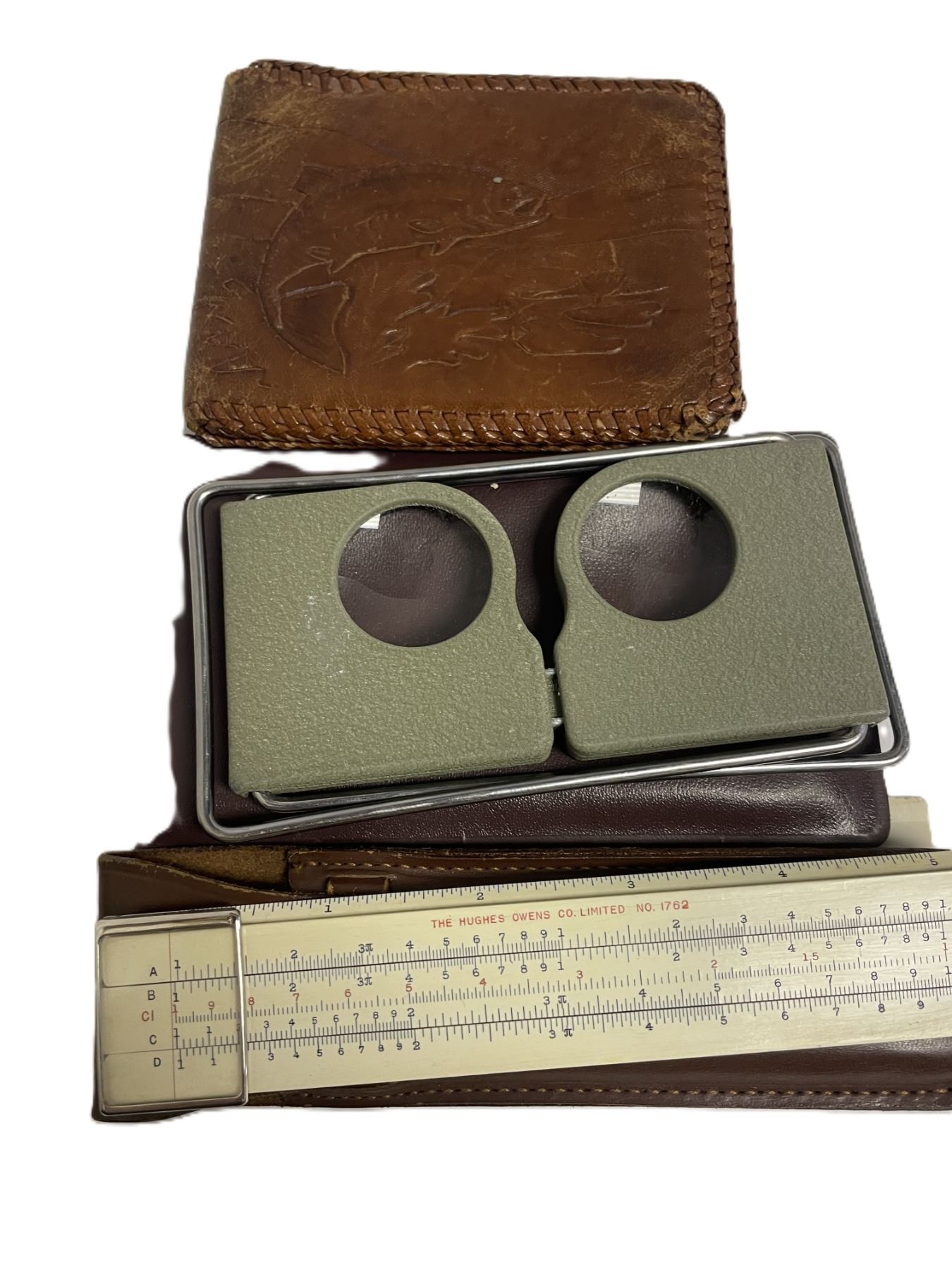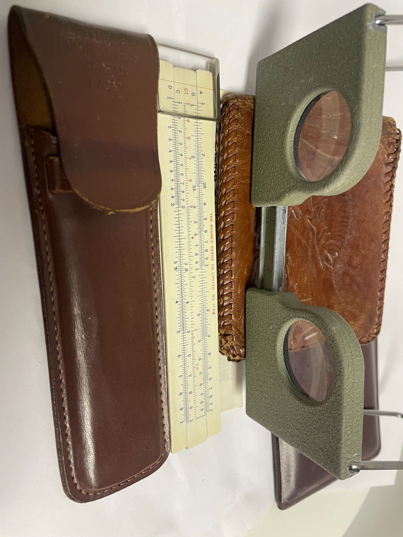 Lot 226 Magnifying glasses in Case, leather wallet, Slide Rule in case