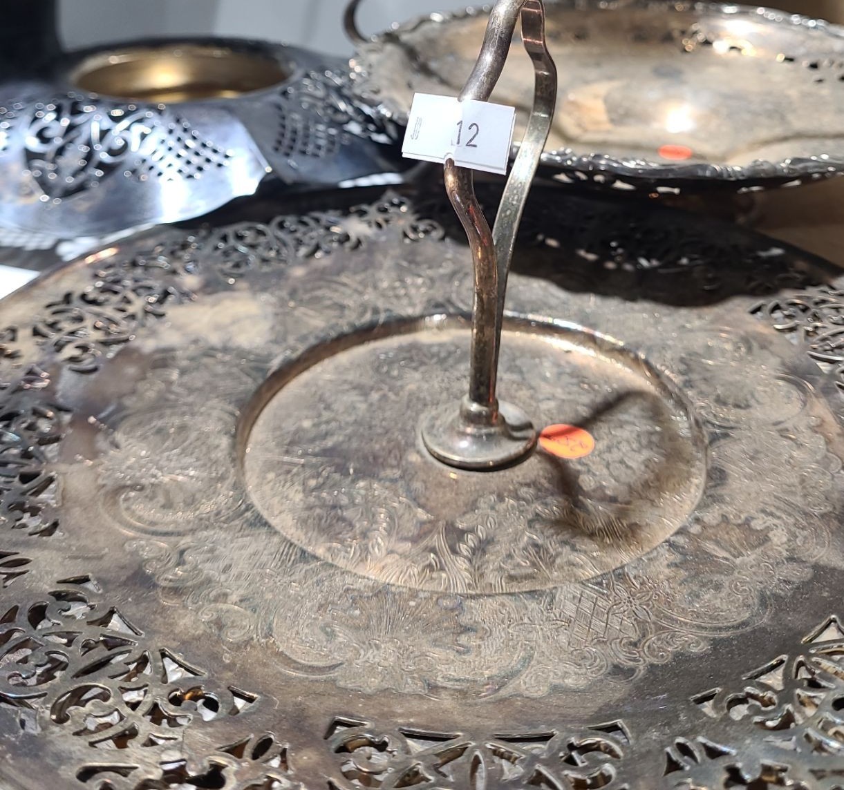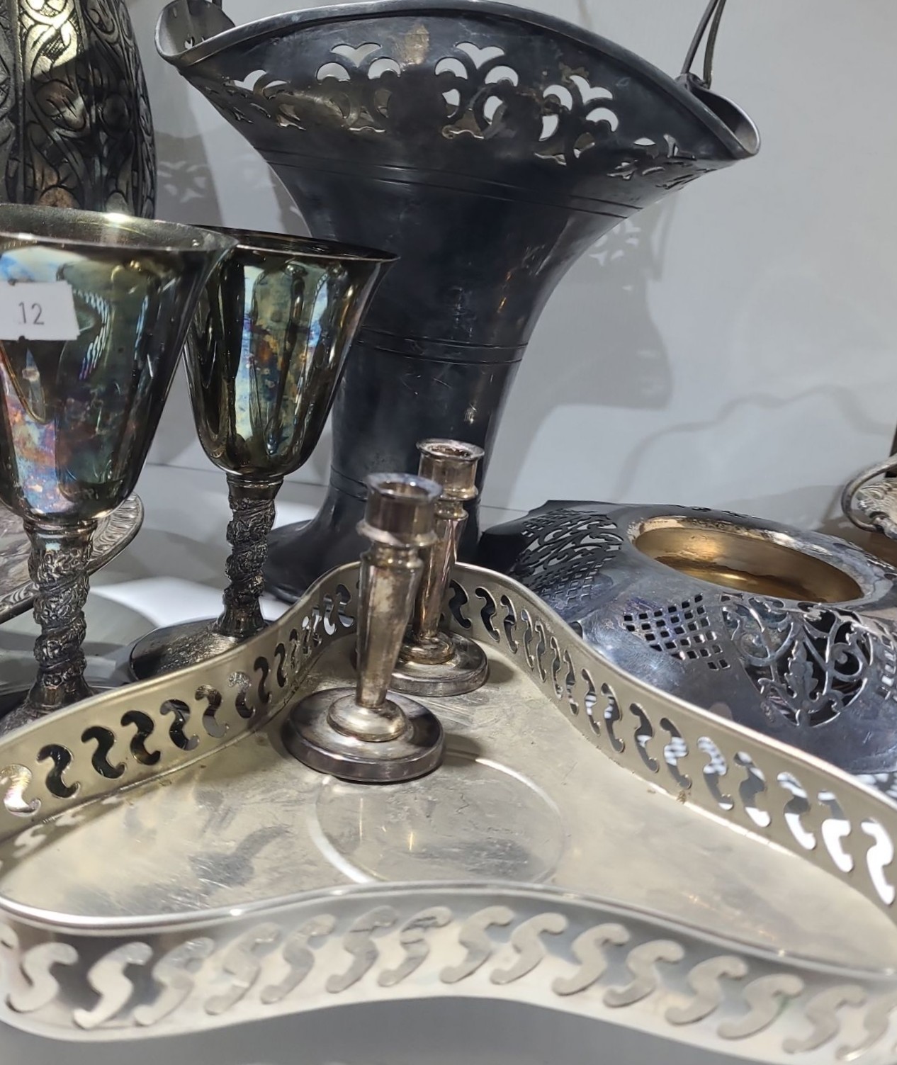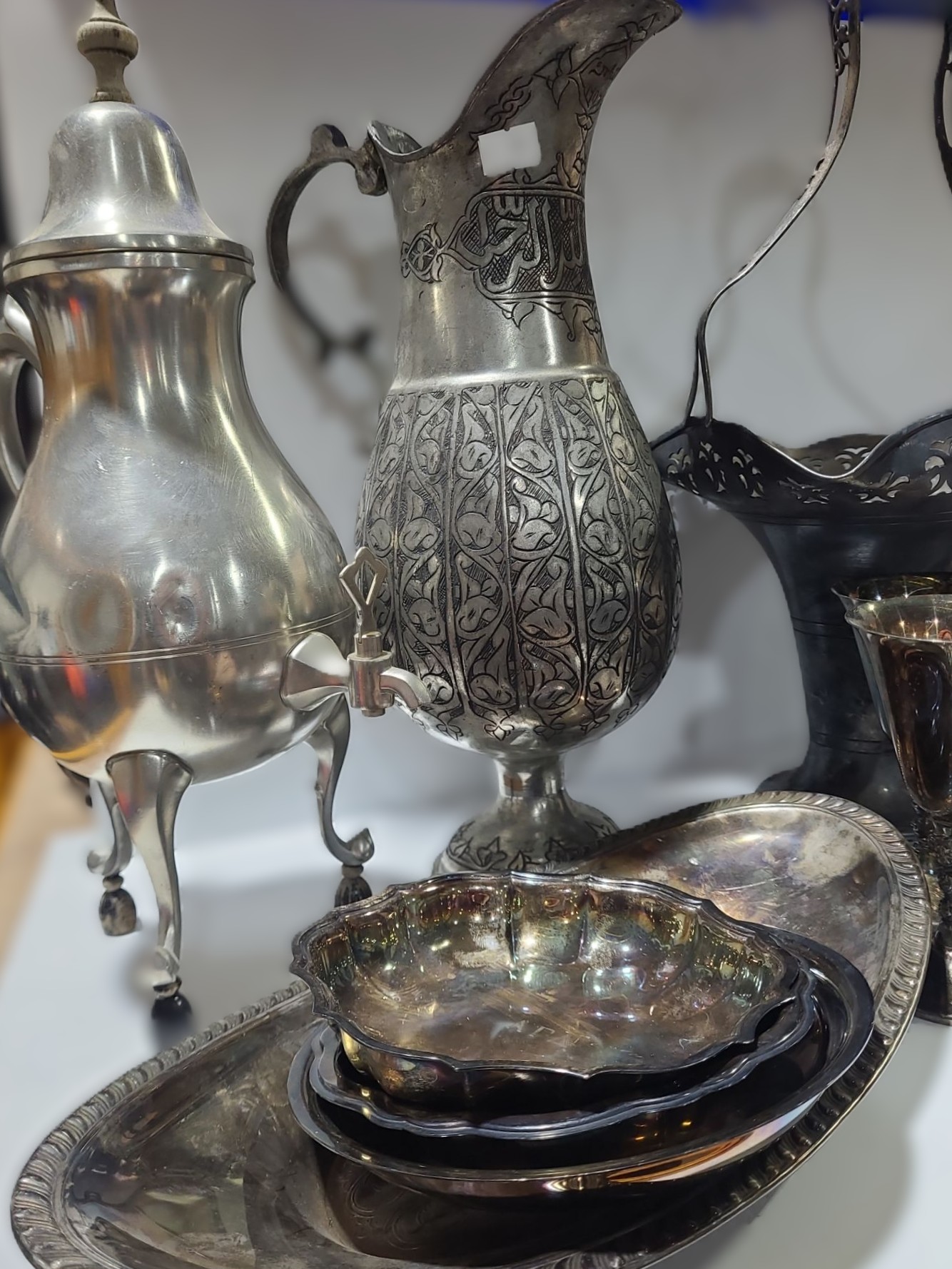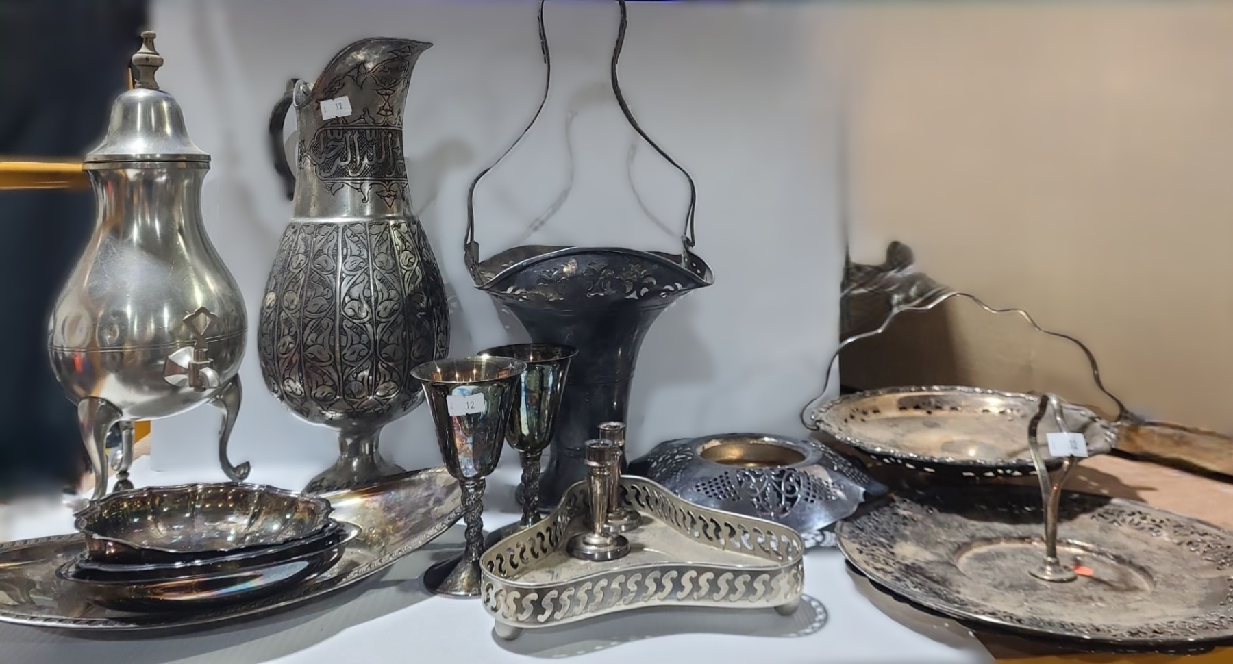 Lot 12 Metalware: Largest Tray: 12.5 x 6.5, Pitcher 13.5 T, Tall Basket 15 T, Serving Plate 10" and More!