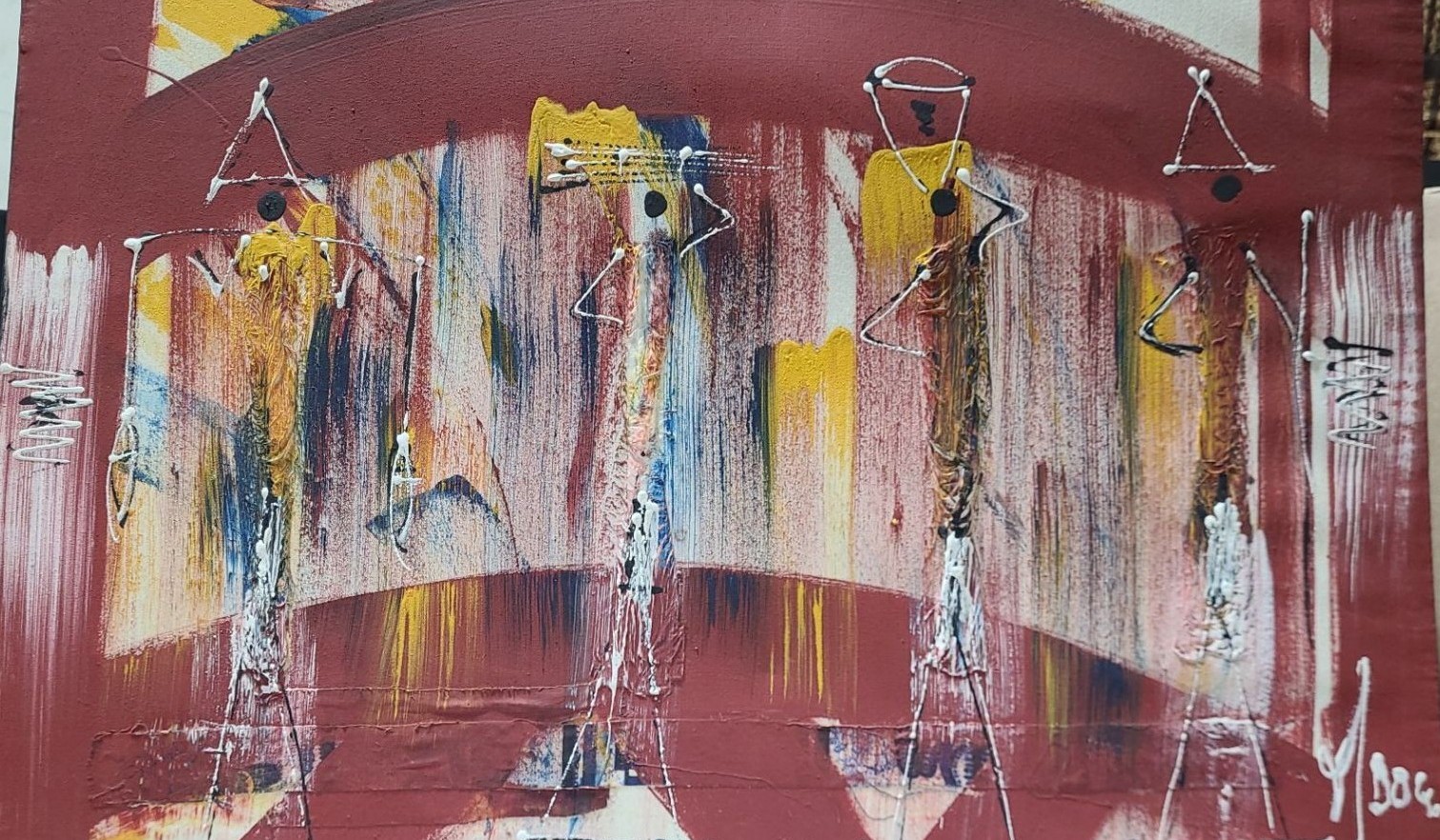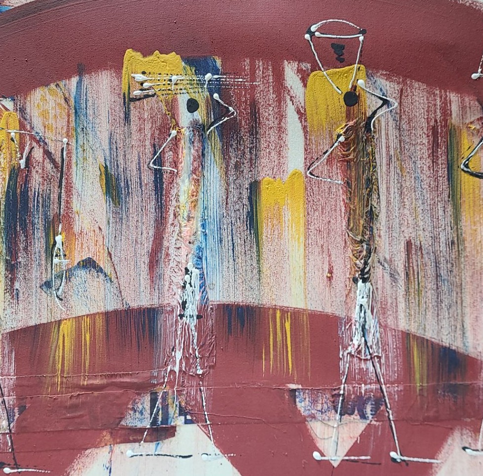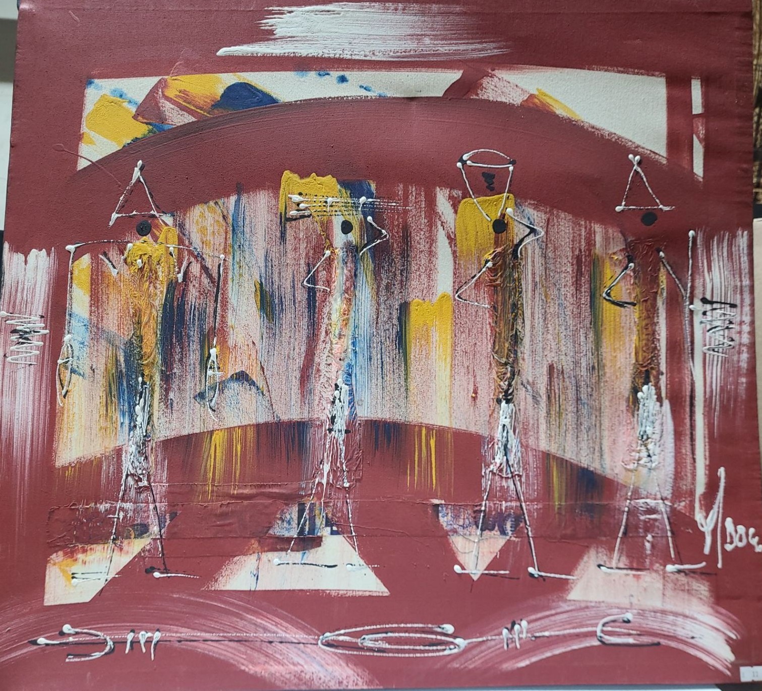 Lot 17 Abstract of Figures Walking w/Supplies, Artist Illegible, 28 x 25 Paint Print on Canvas