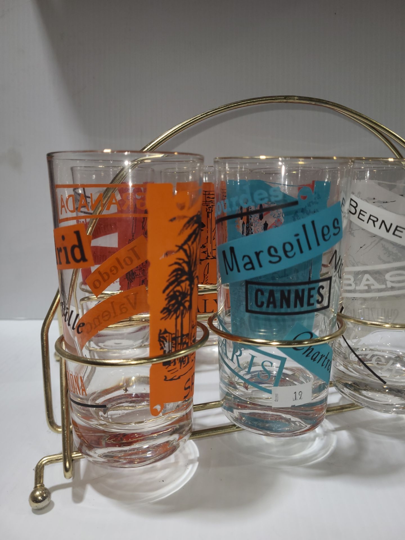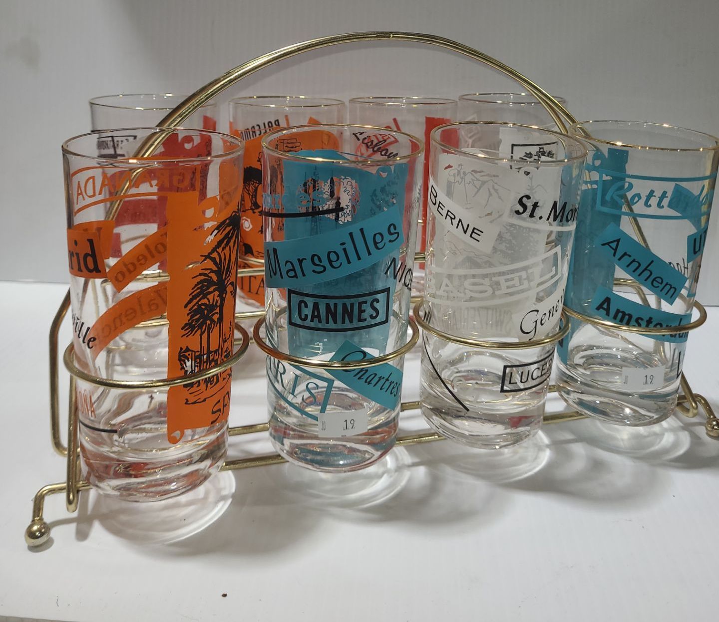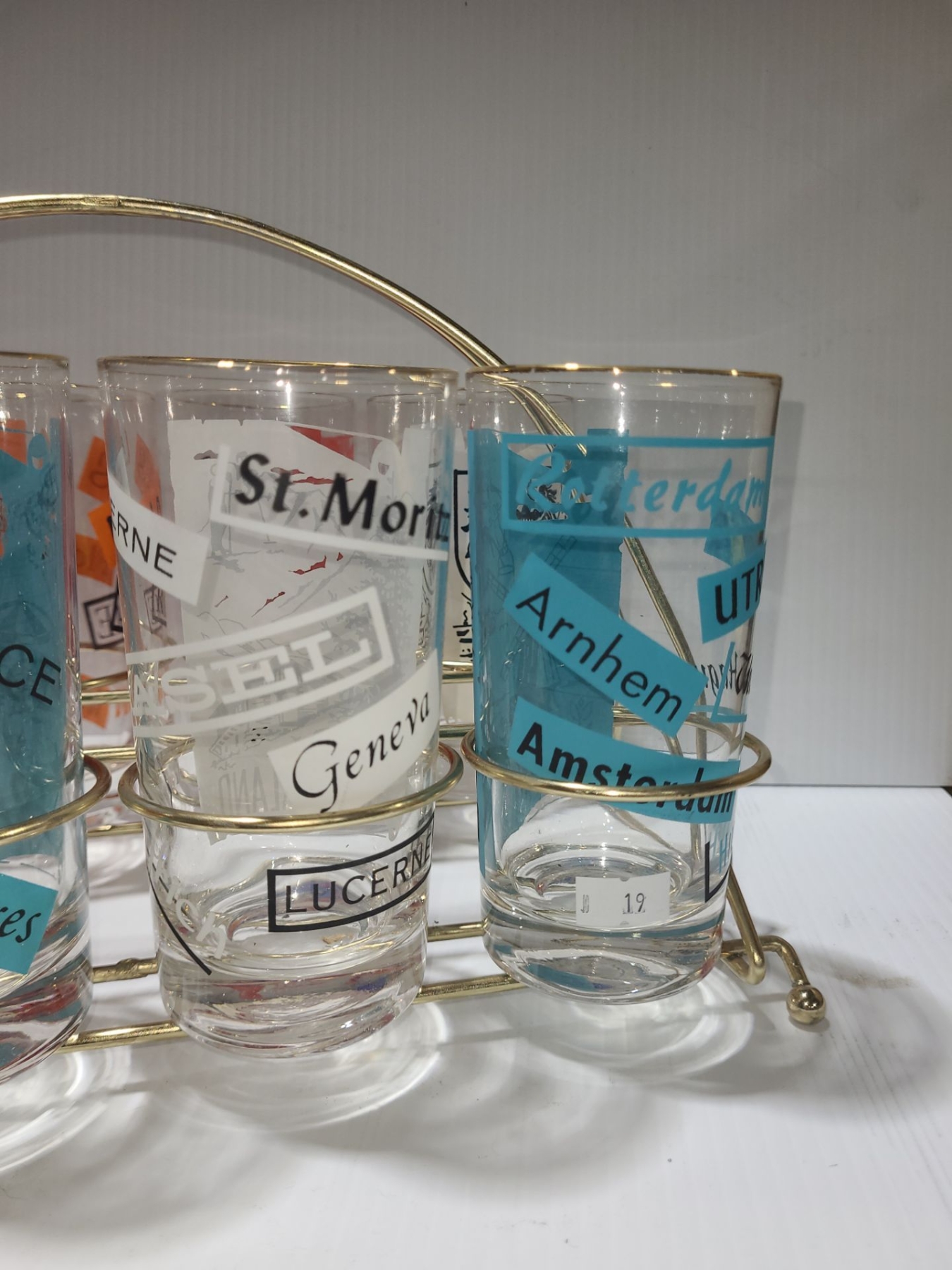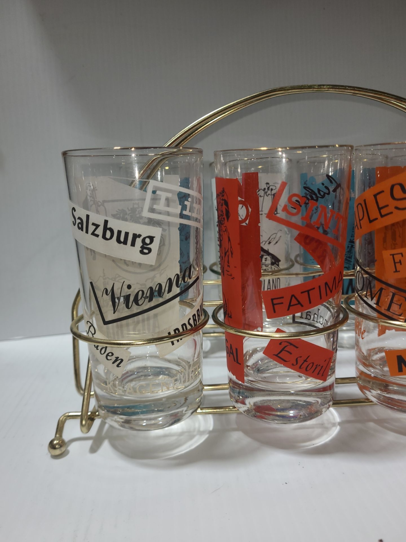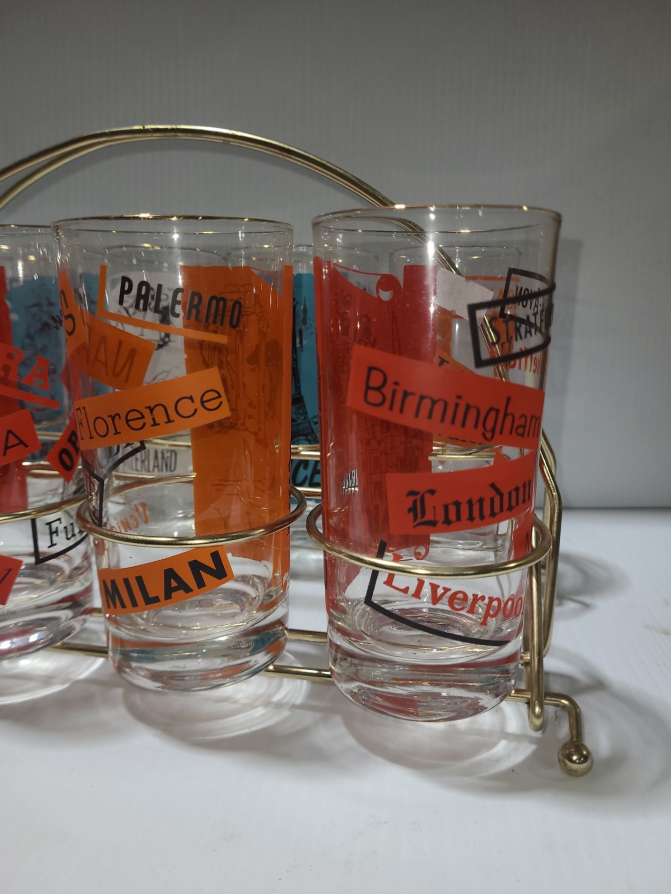 Lot 19 Vintage Glass Display/ Carrier w/ Eight World City Glasses- Carrier: 13 W, 7 D, 8 T