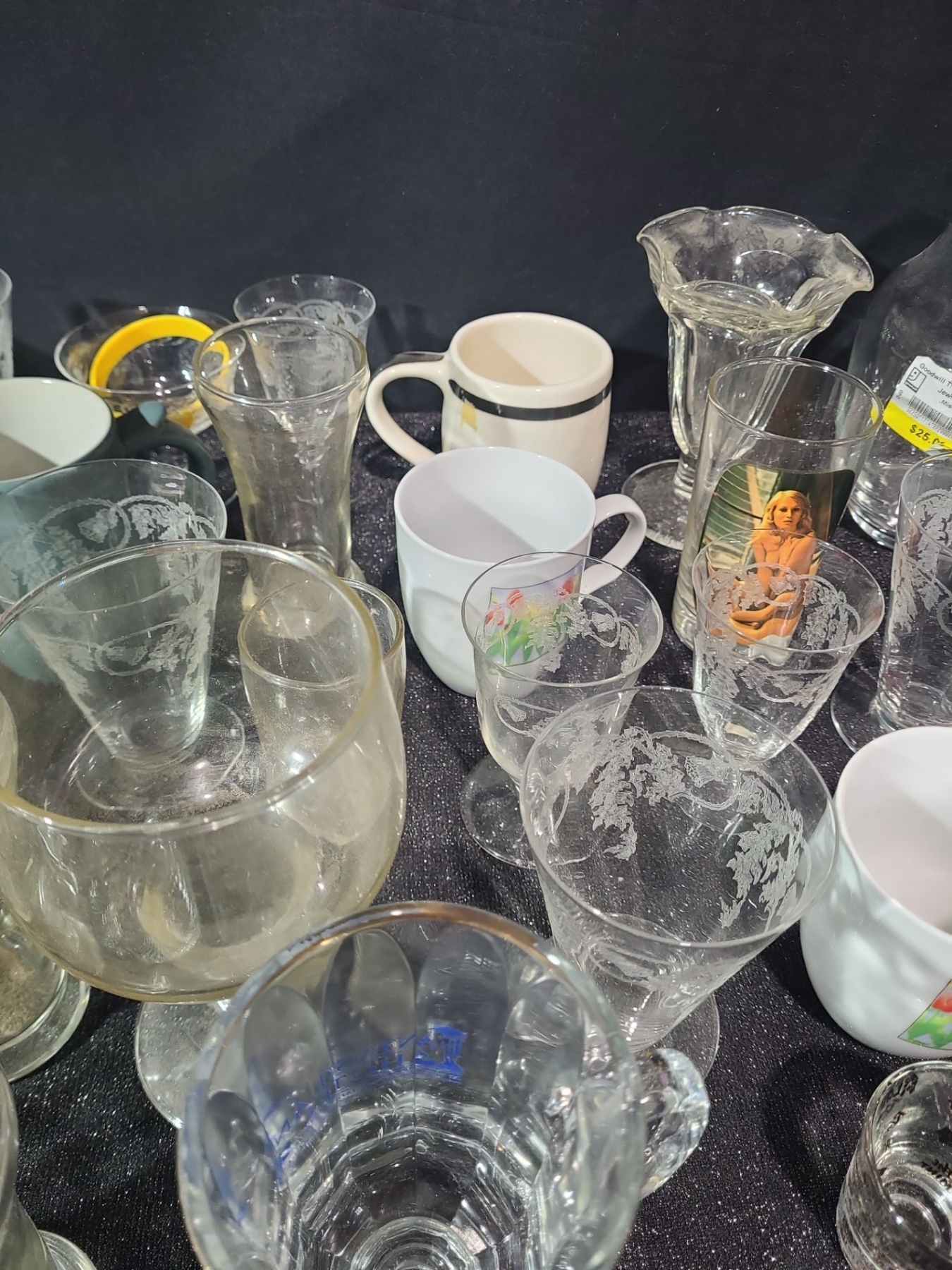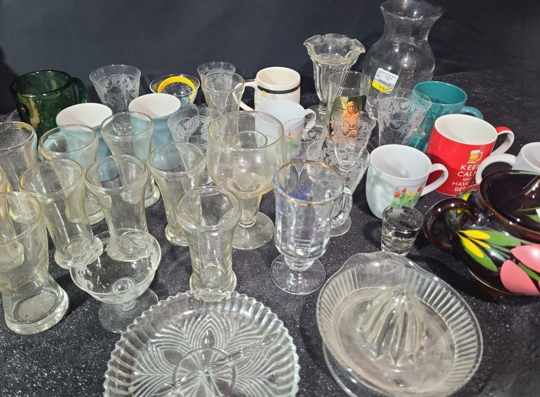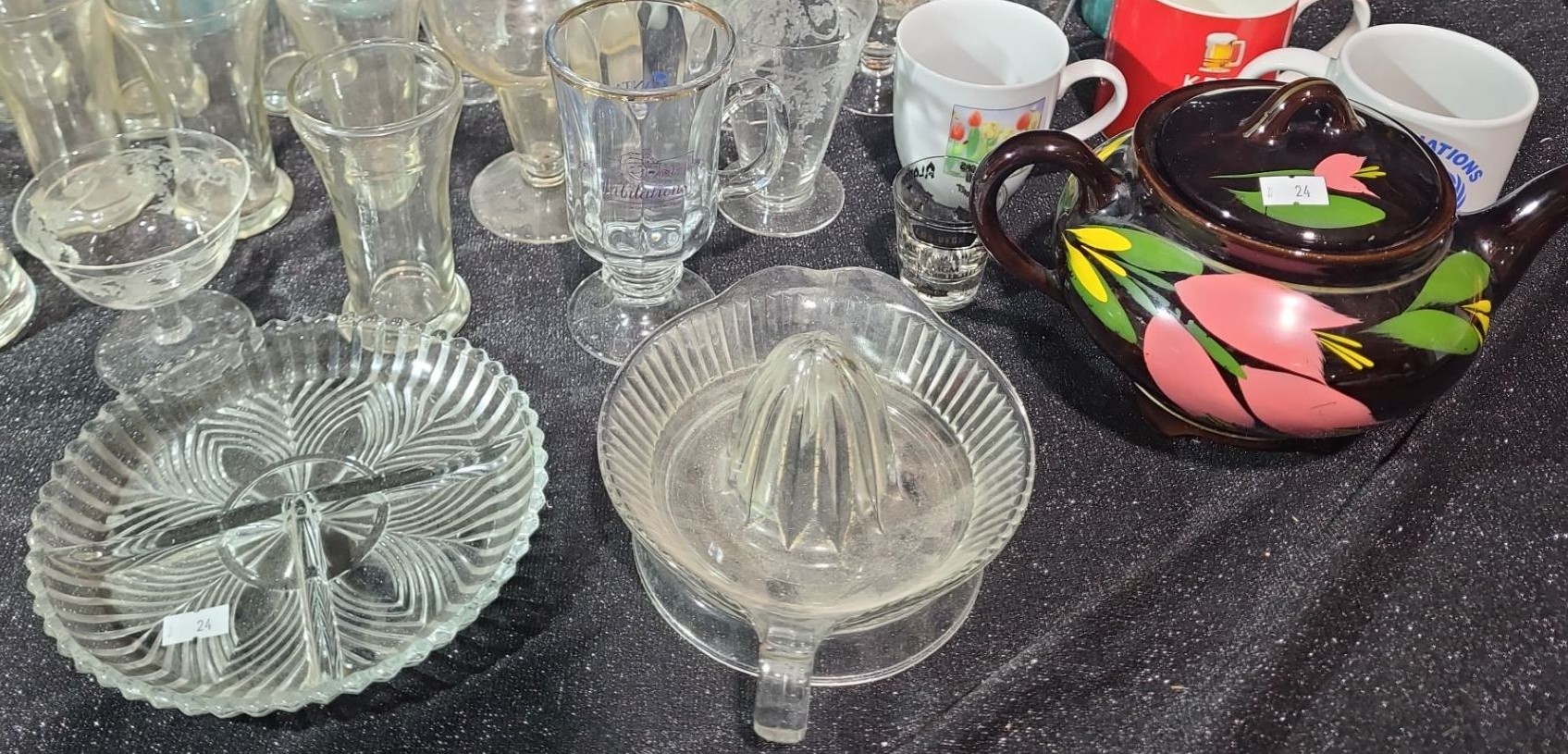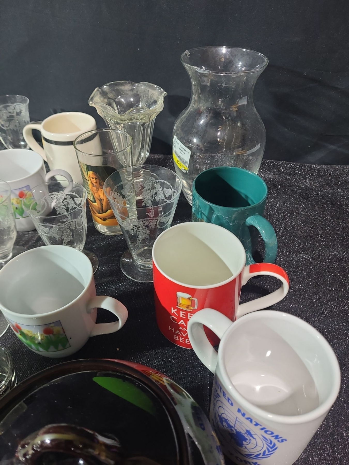 Lot 24 Teapot, Mugs and Assorted Glassware- Tallest vase: 7 T