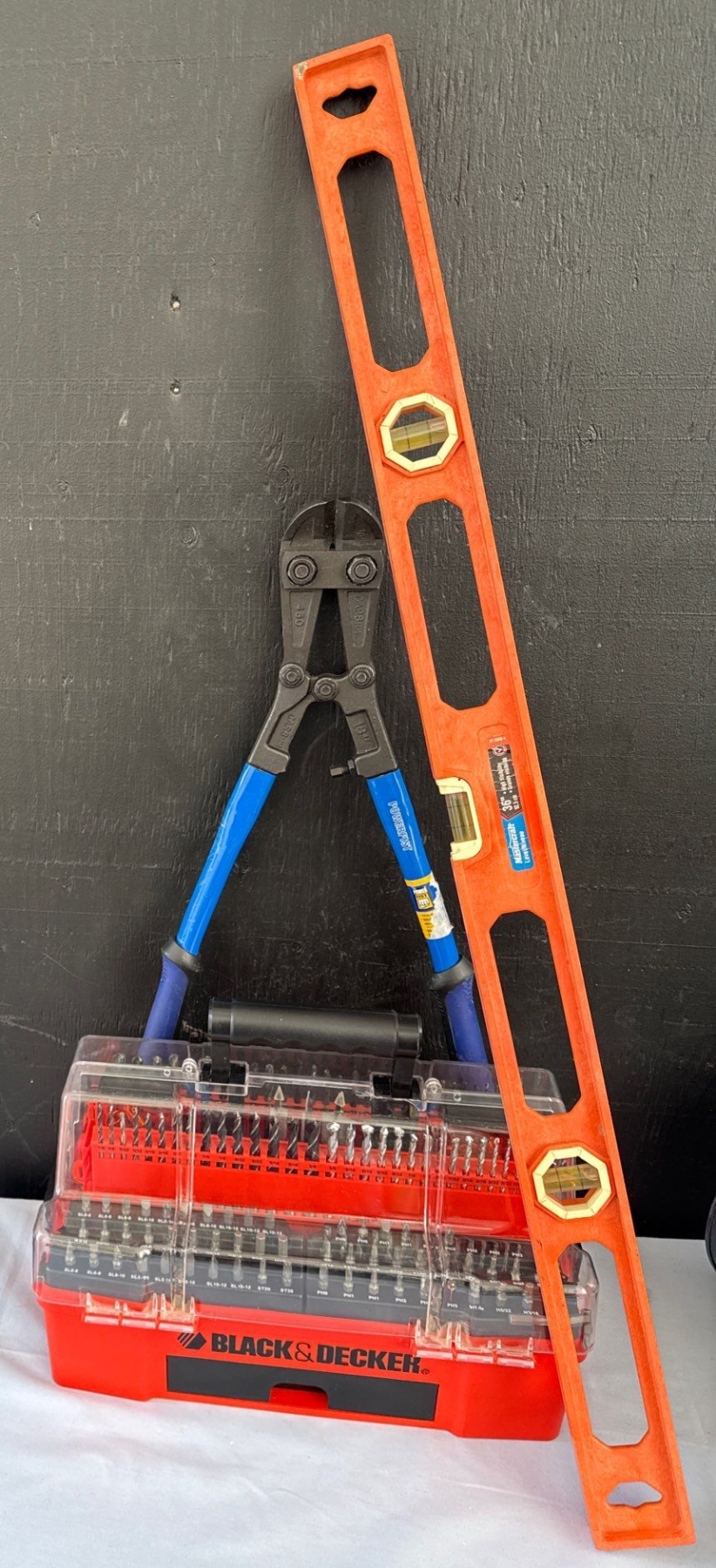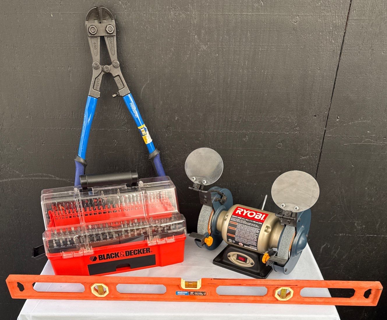 Lot 11 New Tool Collection - Ryobi Bench Grinder 18" Powerfist Bolt Cutters Black & Decker Bit Set