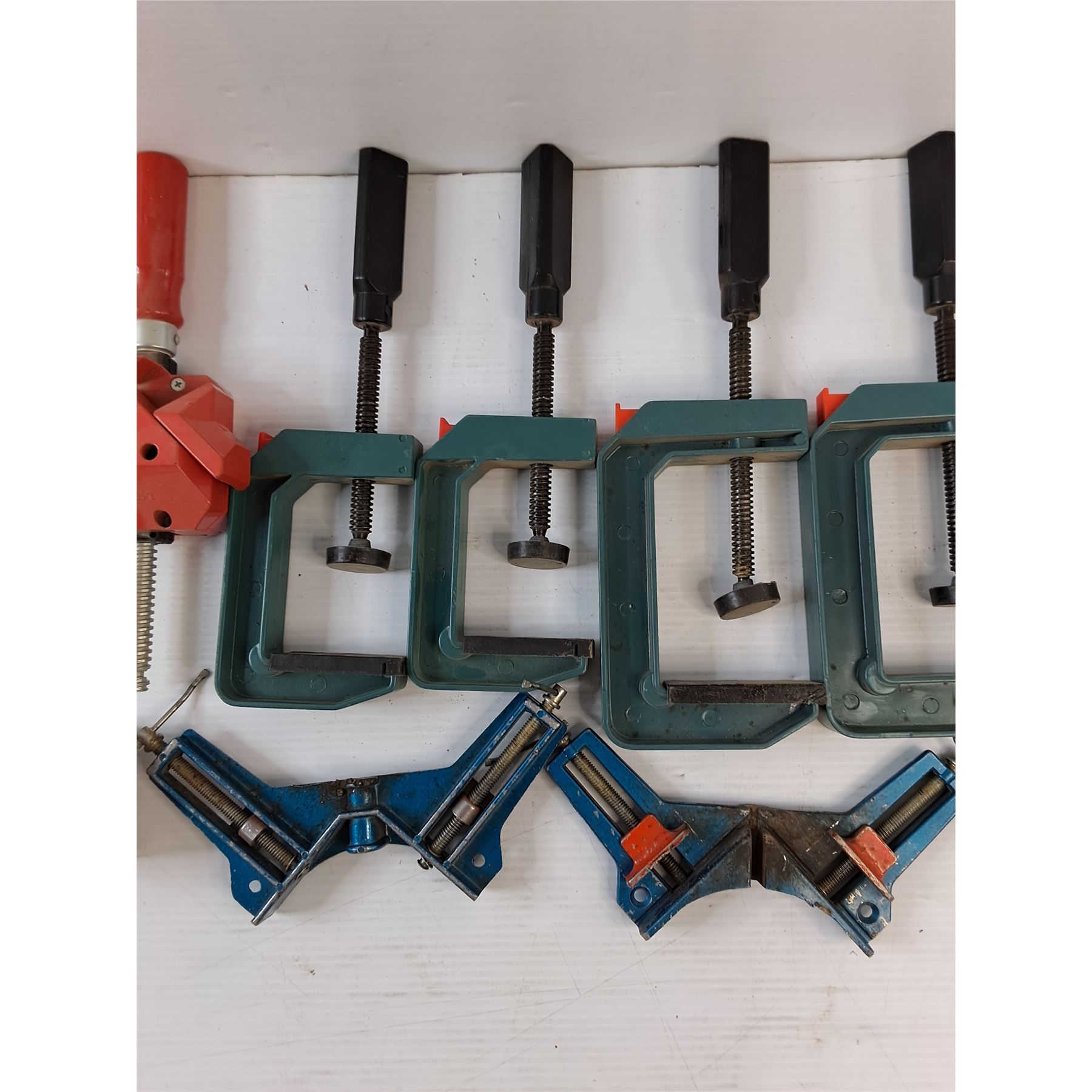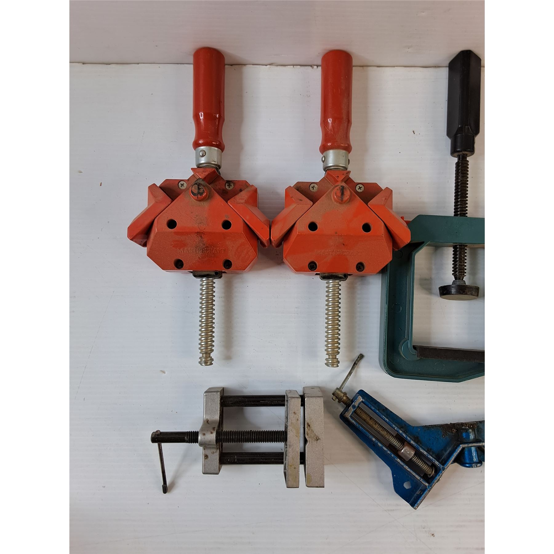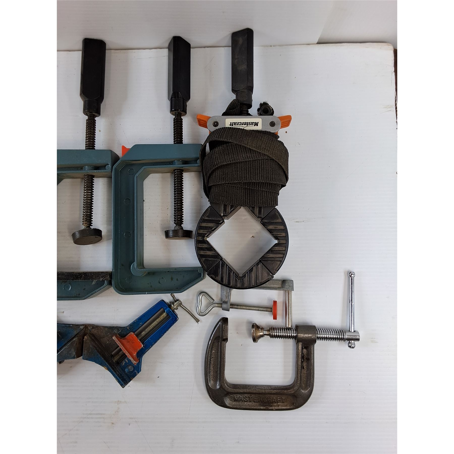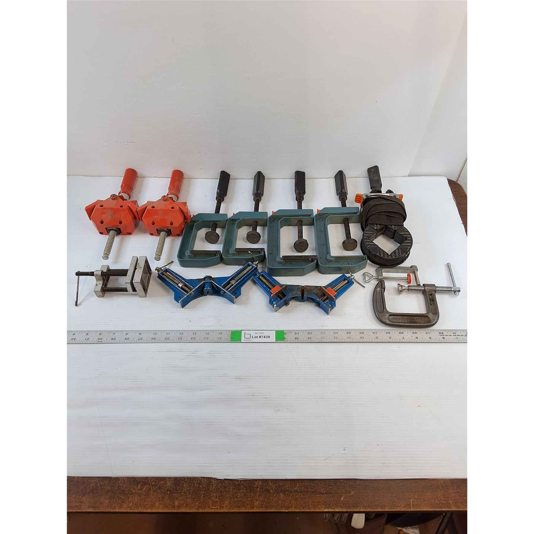 Lot 7439 Assorted Clamps - Band Clamps, C-Clamp, Angle Clamp, Vise, Misc.