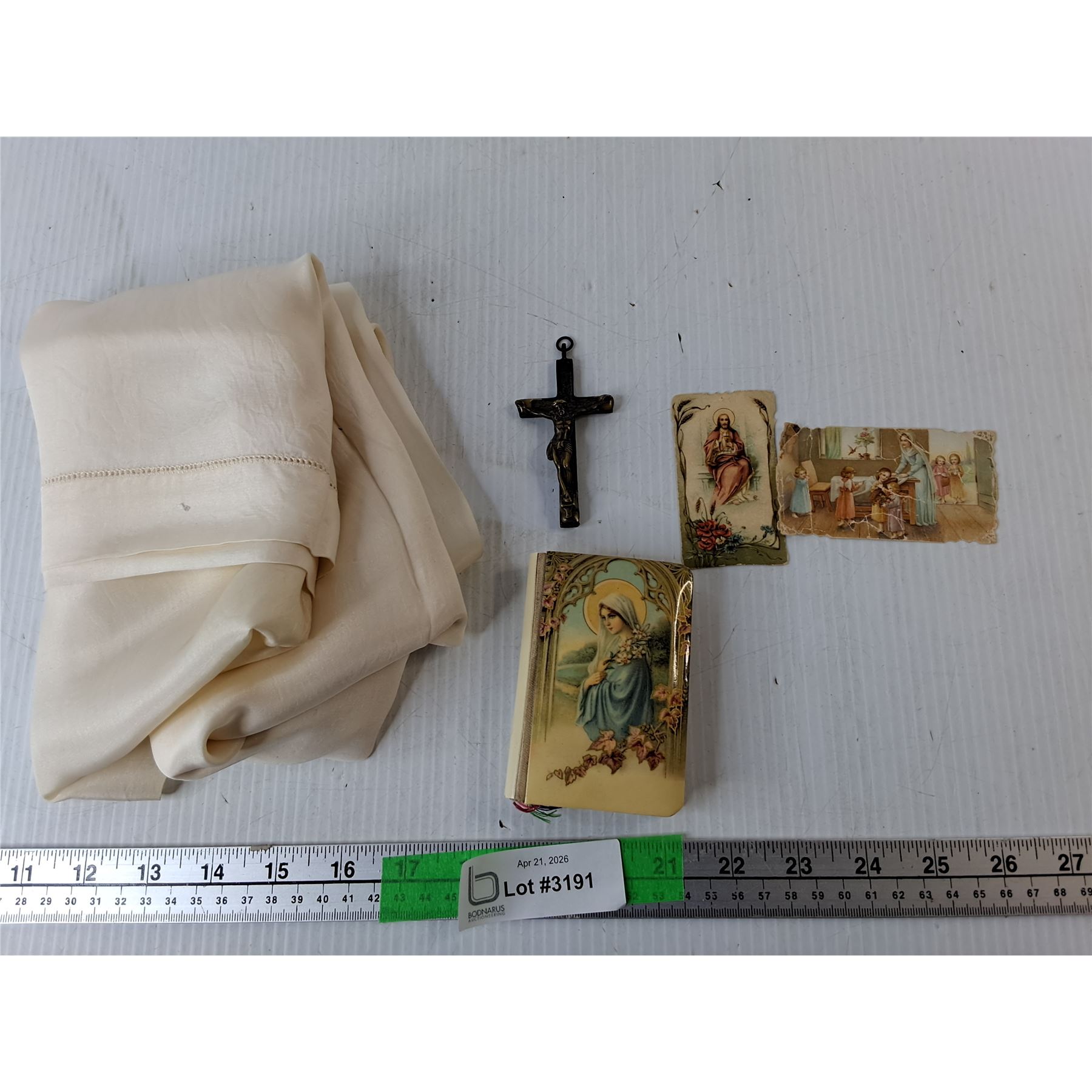Lot 3191 Tablecloth Approx. 48" x 36, Vintage Pocket Bible, Crucifix Pendant, Misc.