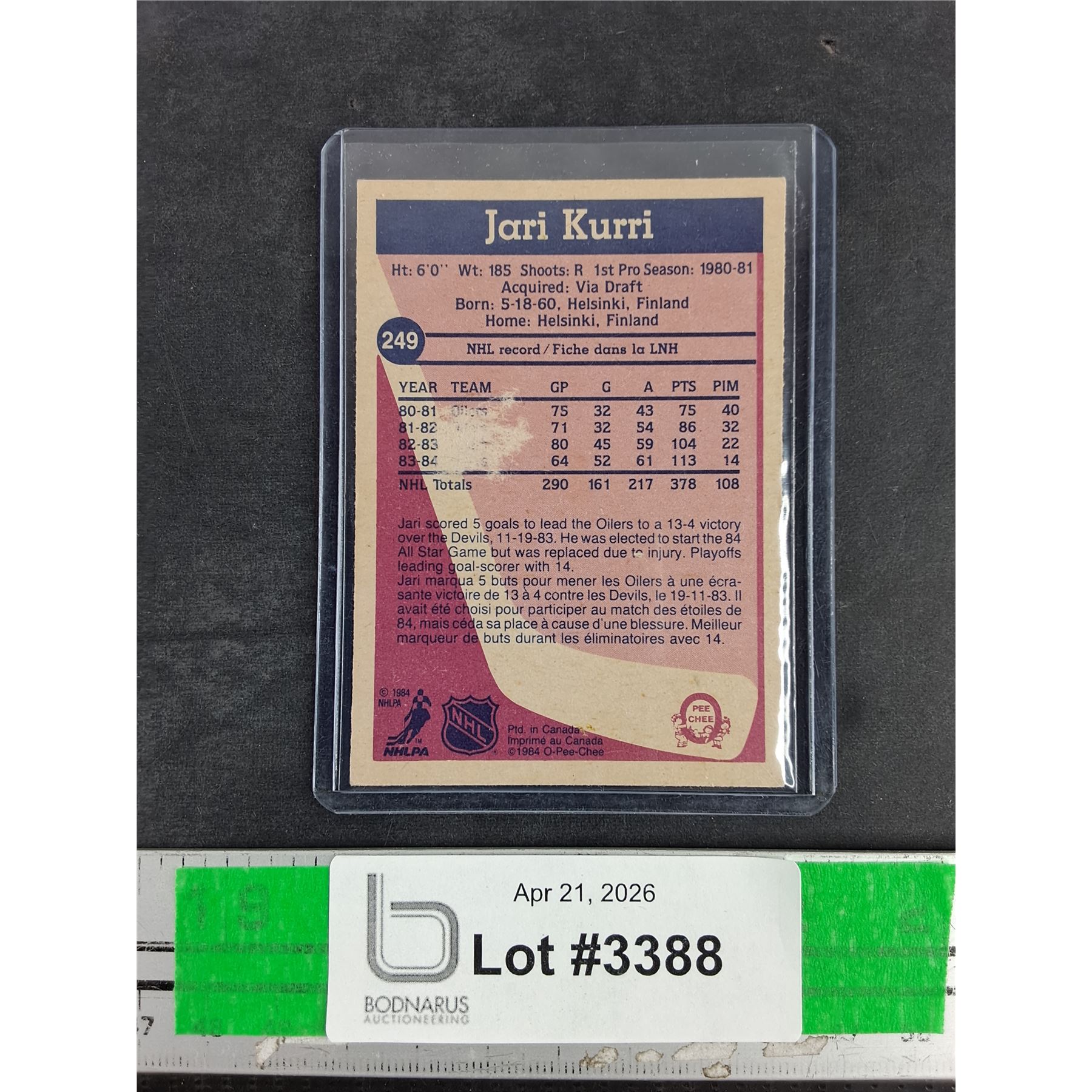 Lot 3388 O Pee Chee Jari Kurri Oilers Hockey Card - CANNOT AUTHENTICATE