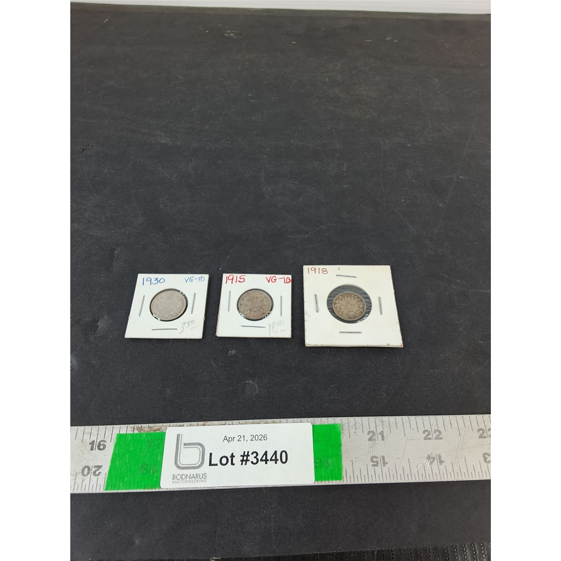 Lot 3440 (3) Vintage Canadian Silver Dimes 1915-1930 ( as is,cannot authenticate)
