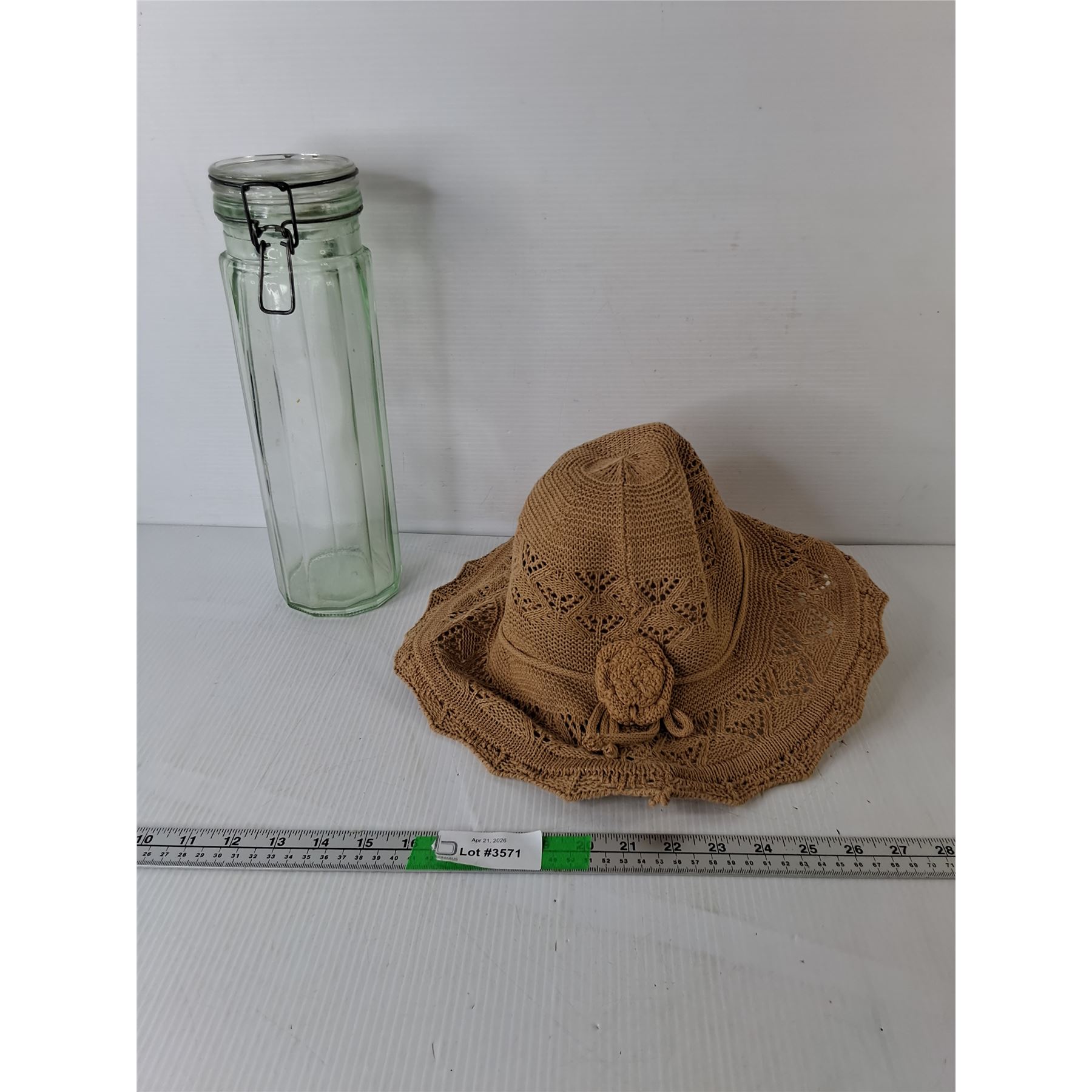Lot 3571 Hermetic Glass Storage Container 13" & Crochet Sun Hat