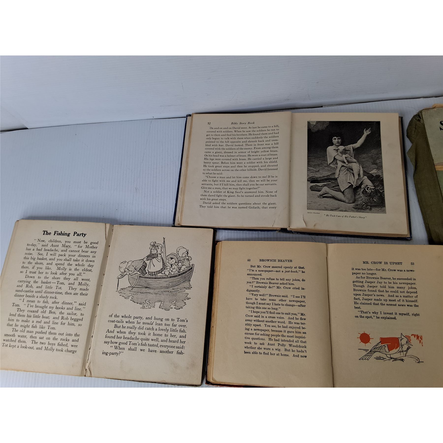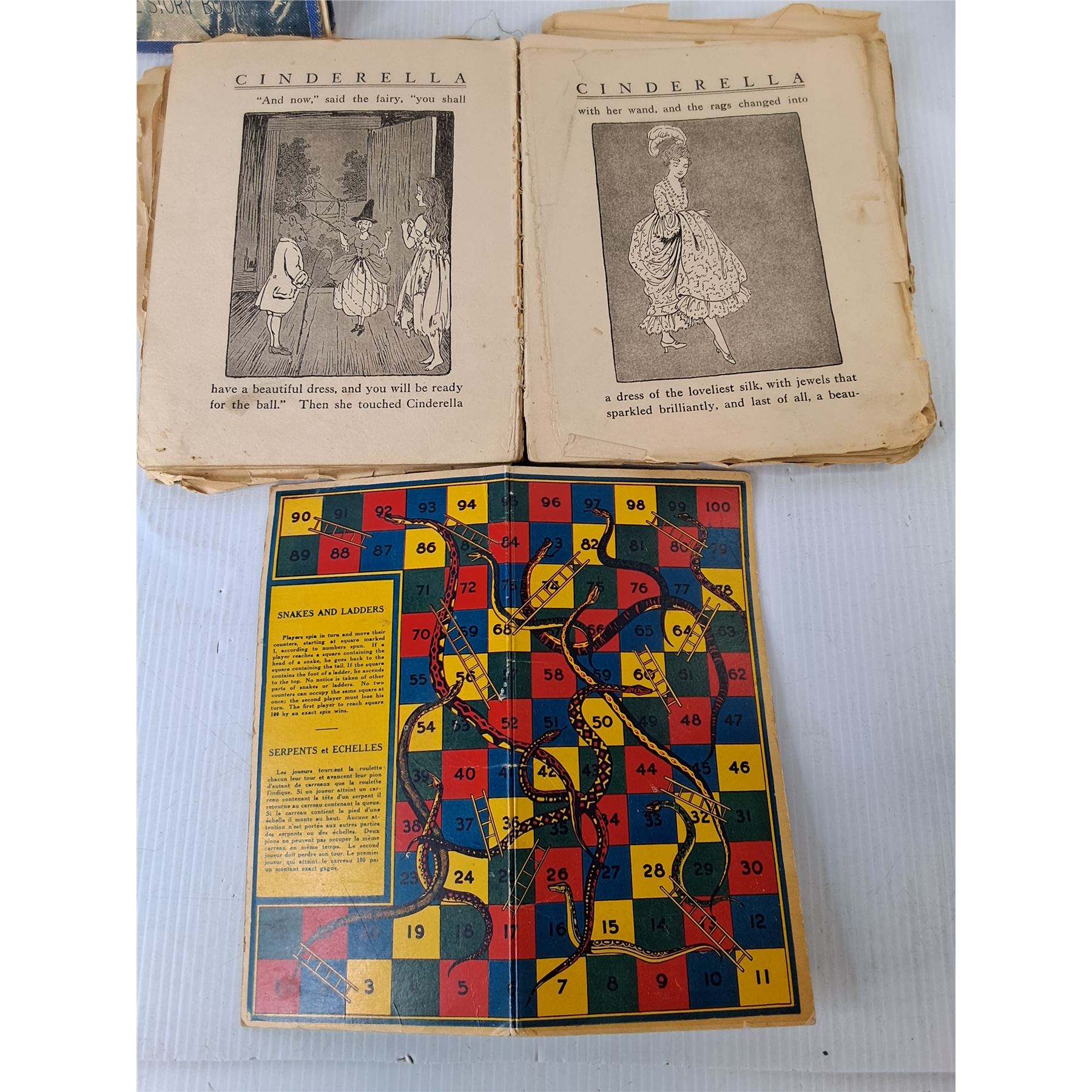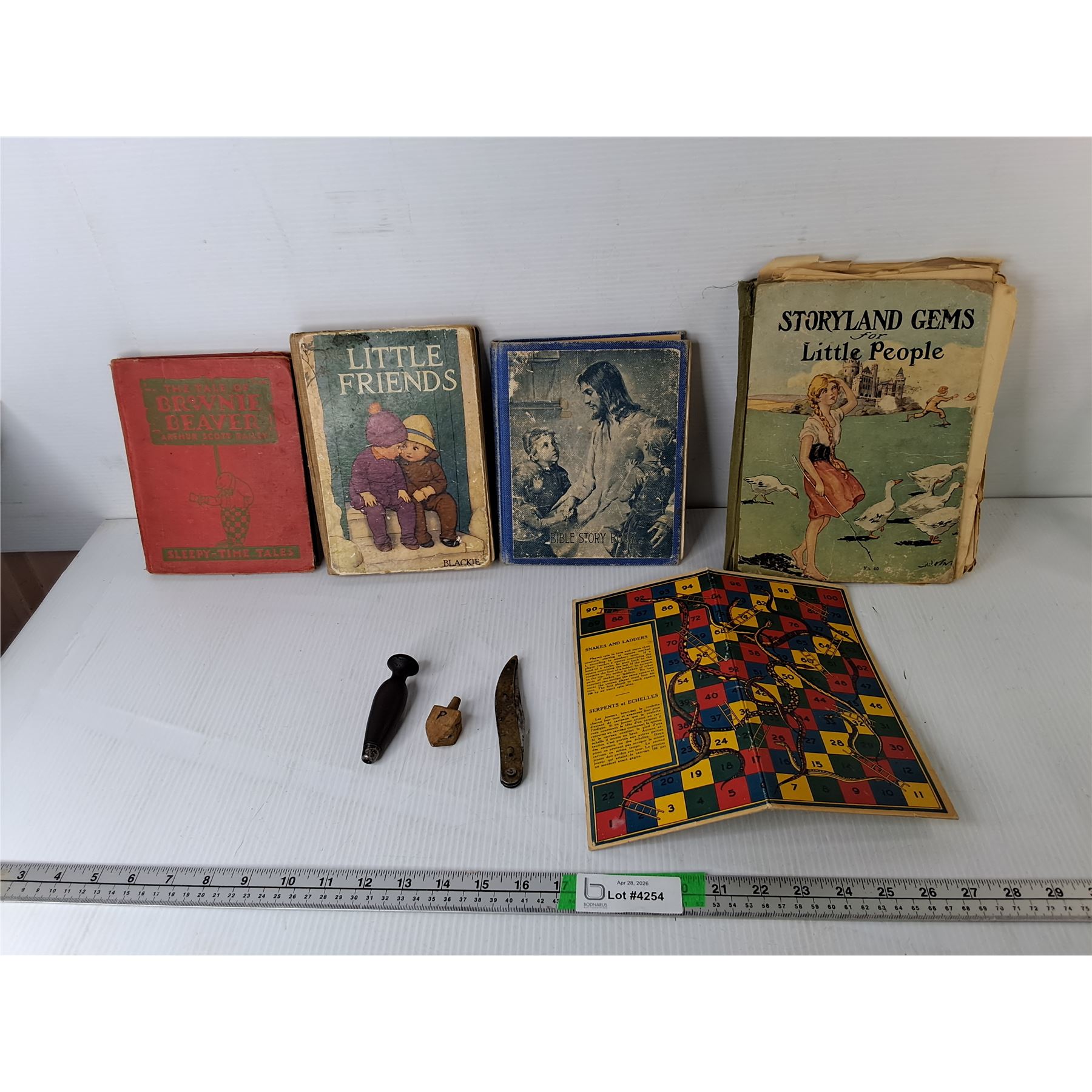 Lot 4254 Vintage Children's Books, Snakes & Ladders Game Board, Wooden Dreidel, Misc.