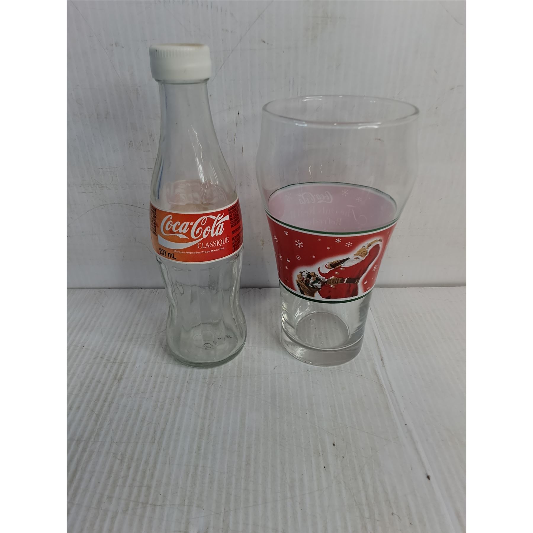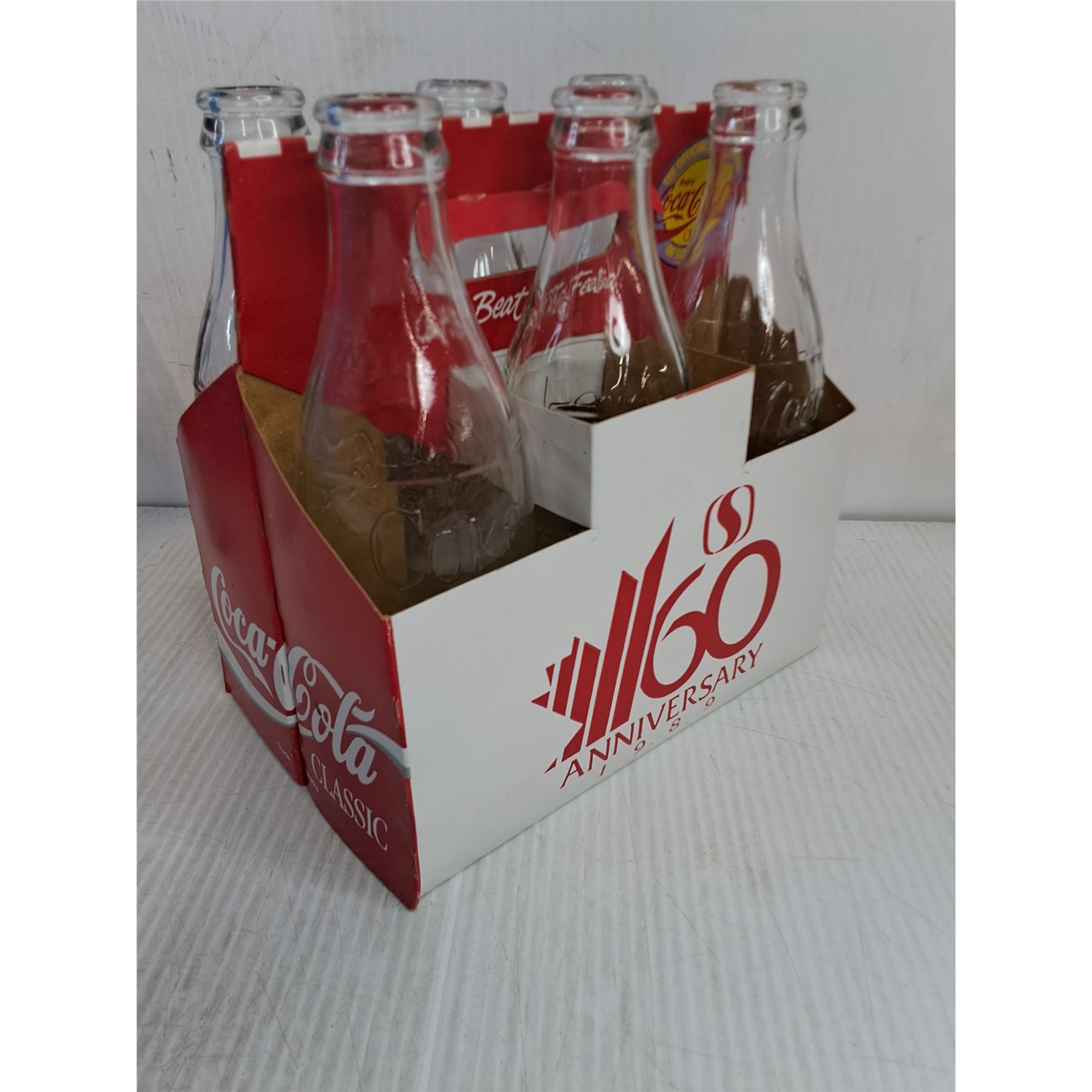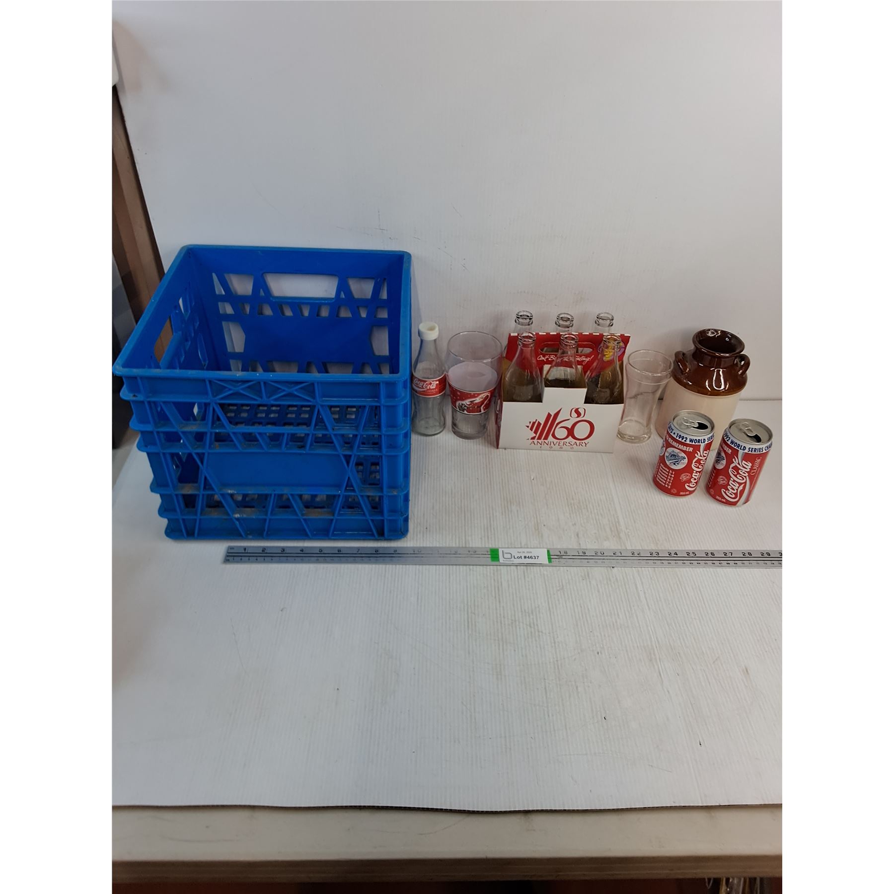 Lot 4637 Assorted Coca Cola Collectible Bottles,Glass,Cans,Small Crock and Beer Glass with Blue Crate
