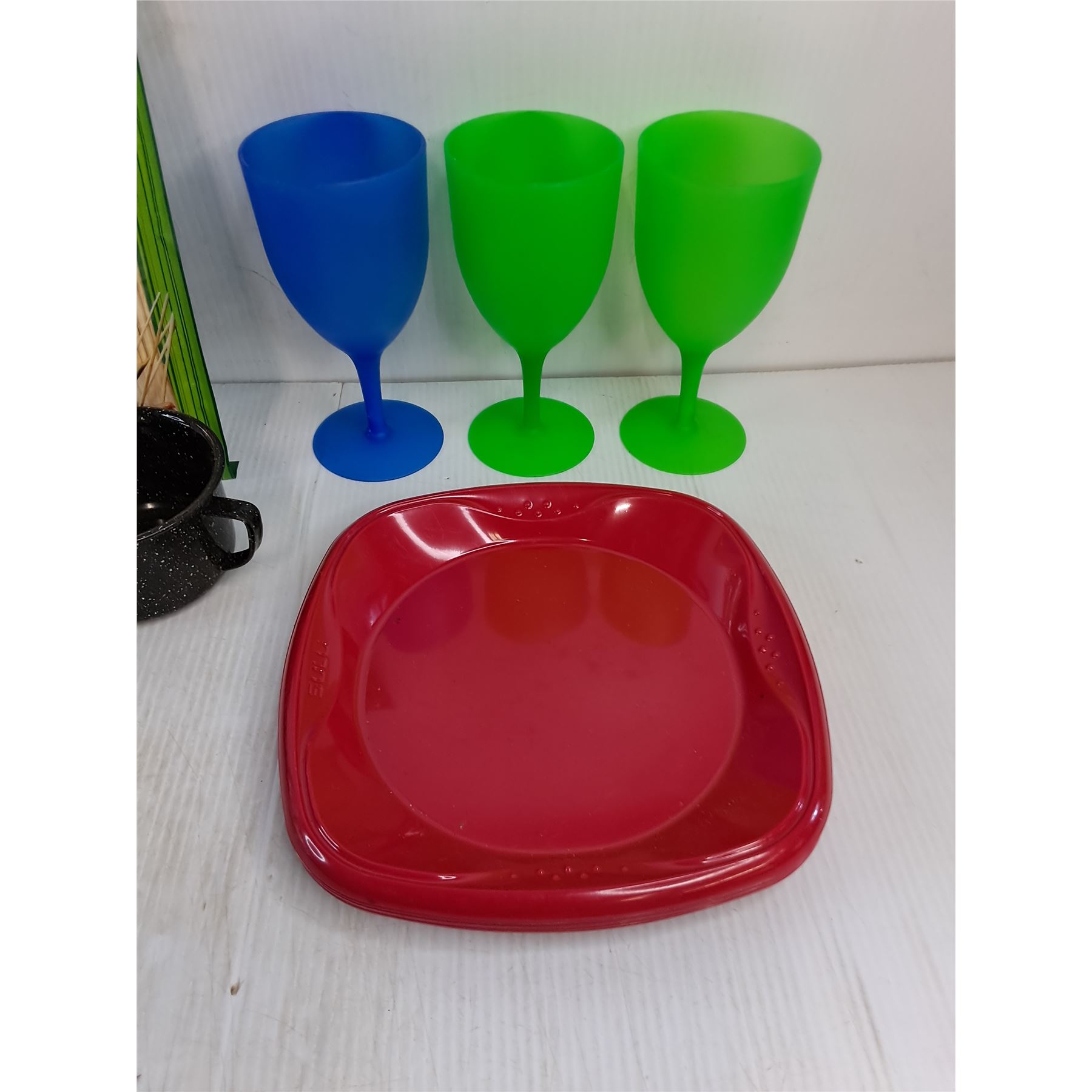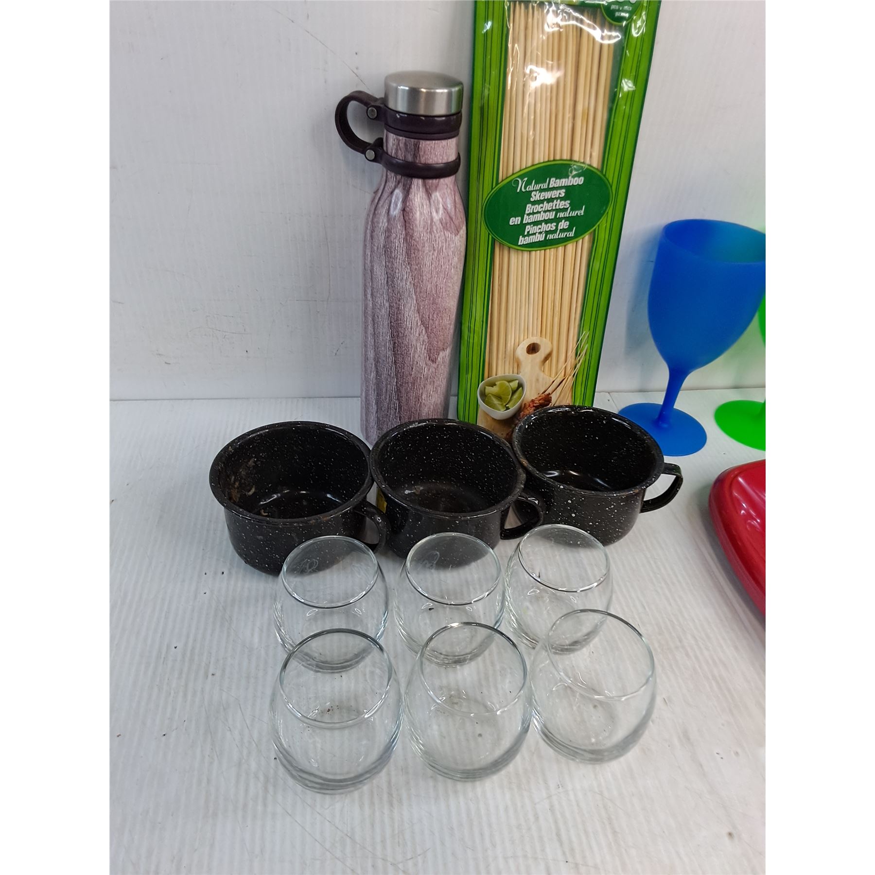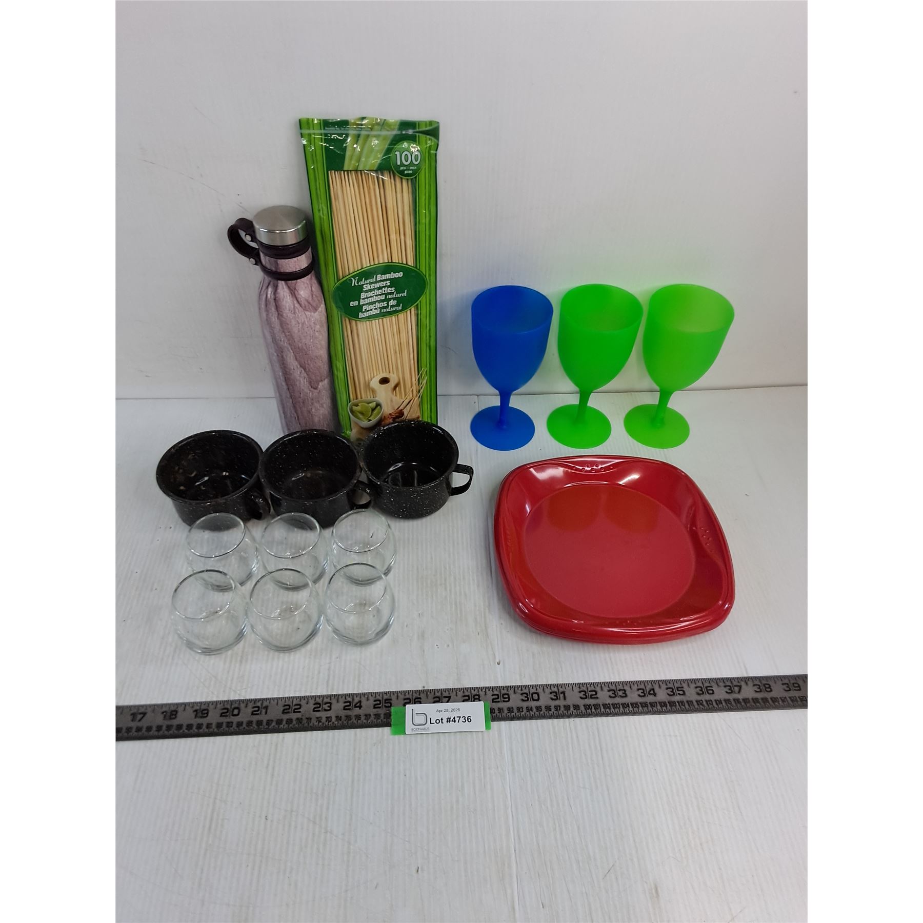 Lot 4736 Assorted Mugs & Glasses, Disposable Plates, Sealed Skewers